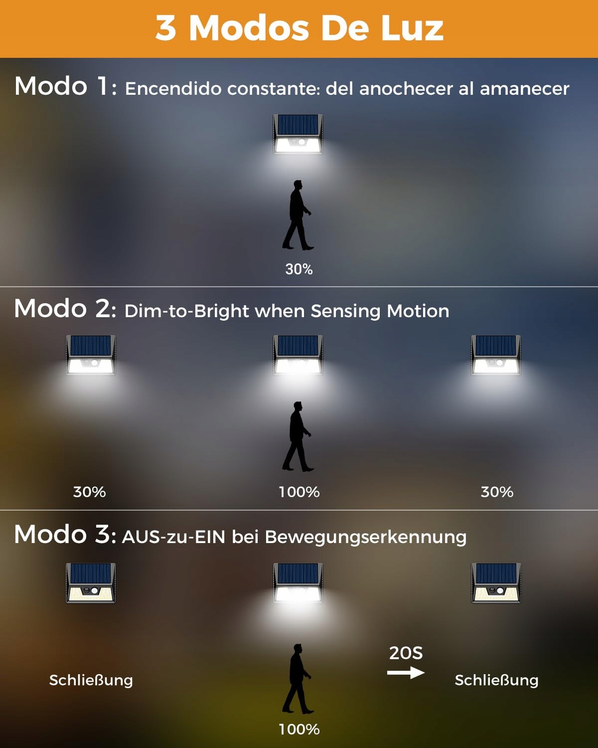 3 tryby oświetlenia: Nasza lampa solarna na zewnątrz działa od zmierzchu do świtu i ma 3 tryby oświetlenia: 1. Tryb normalnie włączony 2. Tryb czujnika zmierzchu 3. Tryb czujnika światła. Czas świecenia wynosi 20 sekund i automatycznie się wydłuża po wykryciu ruchu. Tryb 3 jest najbardziej energooszczędny i wydłuża żywotność baterii, dlatego jest zalecaną opcją