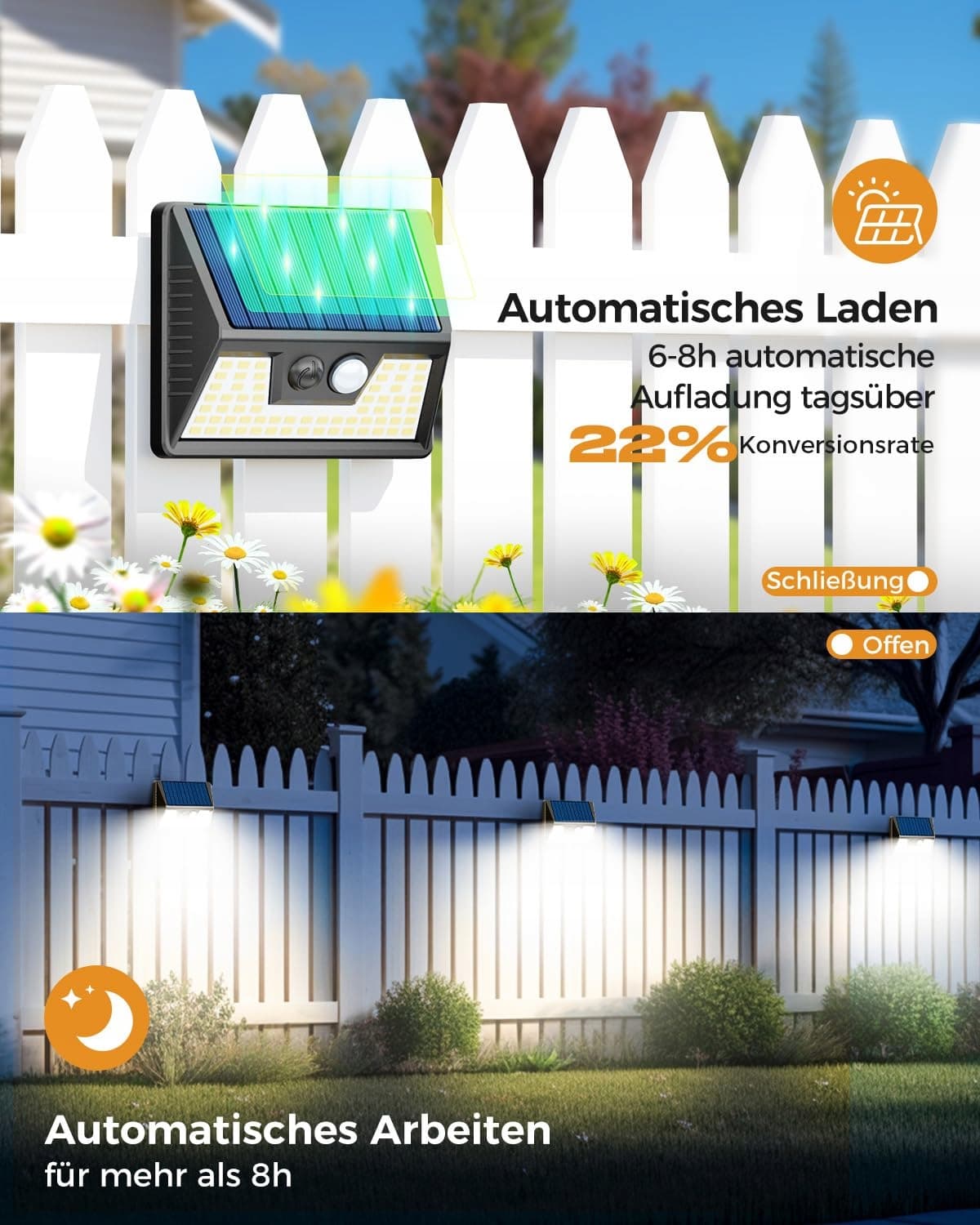 Szybkie ładowanie i długie świecenie: Wyposażona w wysoko wydajny panel solarny o współczynniku konwersji do 22%, ta lampa solarna z czujnikiem ruchu zapewnia minimalny czas ładowania i jednocześnie dostarcza jasne i długotrwałe światło. Ciesz się idealnym połączeniem kompaktowego designu, wydajności i jasności z lampą solarną z czujnikiem ruchu