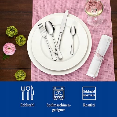 Wszystkie 24 części sztućców wykonane są z nierdzewnej, polerowanej stali 18/10, dzięki czemu nadają się do zmywarki - szczególnie trwałe i odporne