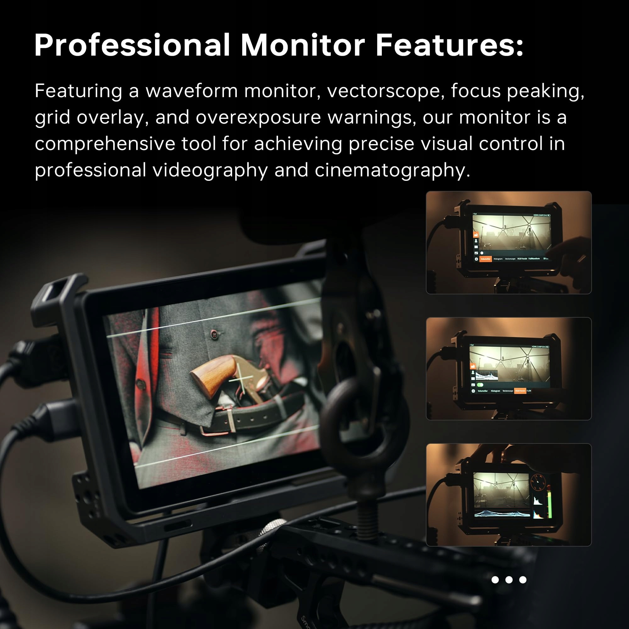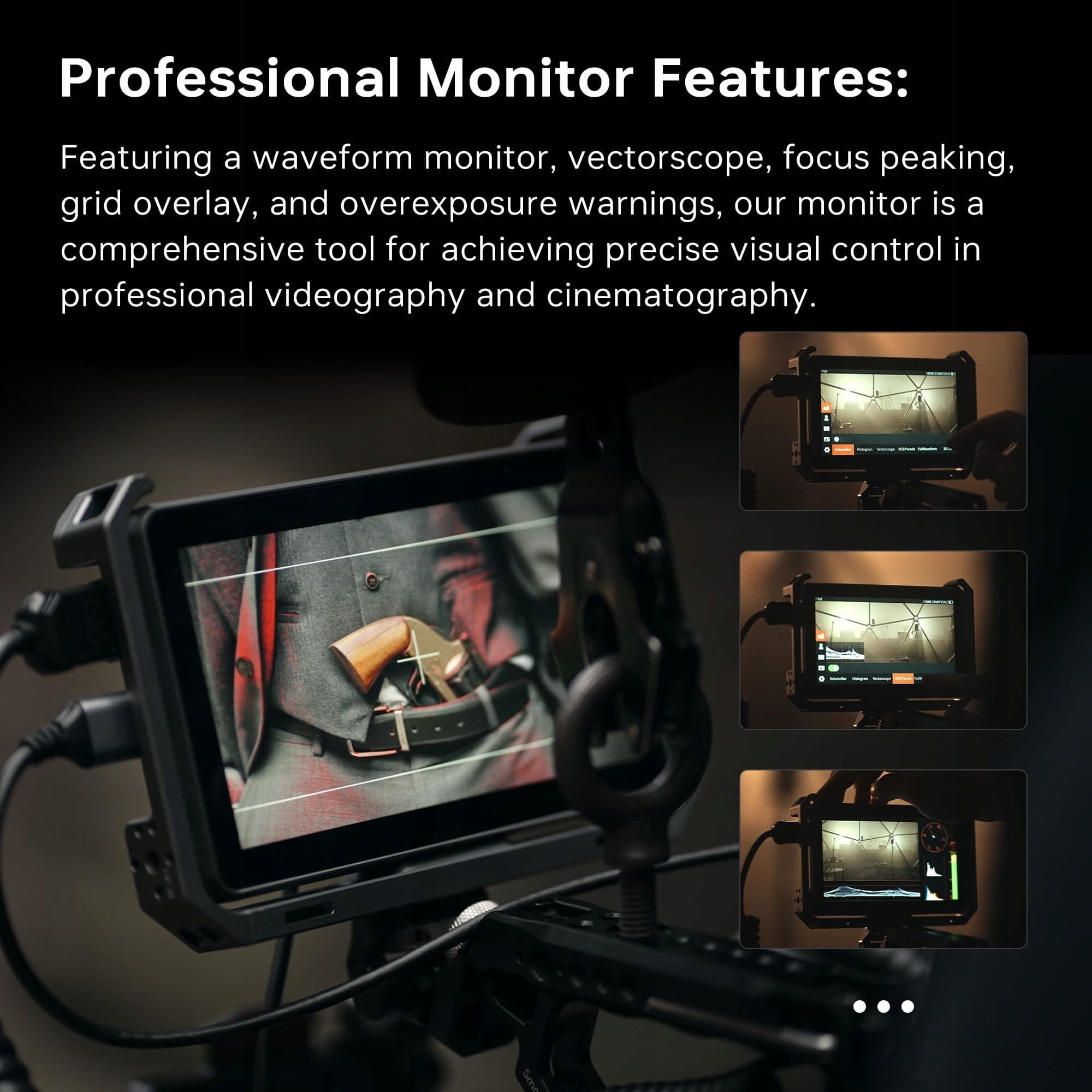 Precyzyjne narzędzia do profesjonalnych nagrań: Monitor oferuje wiele przydatnych funkcji, w tym Focus Peaking, 3D LUT i funkcję anamorphic De-Squeeze, które ułatwiają ustawianie ostrości i profesjonalną optymalizację jakości obrazu.
