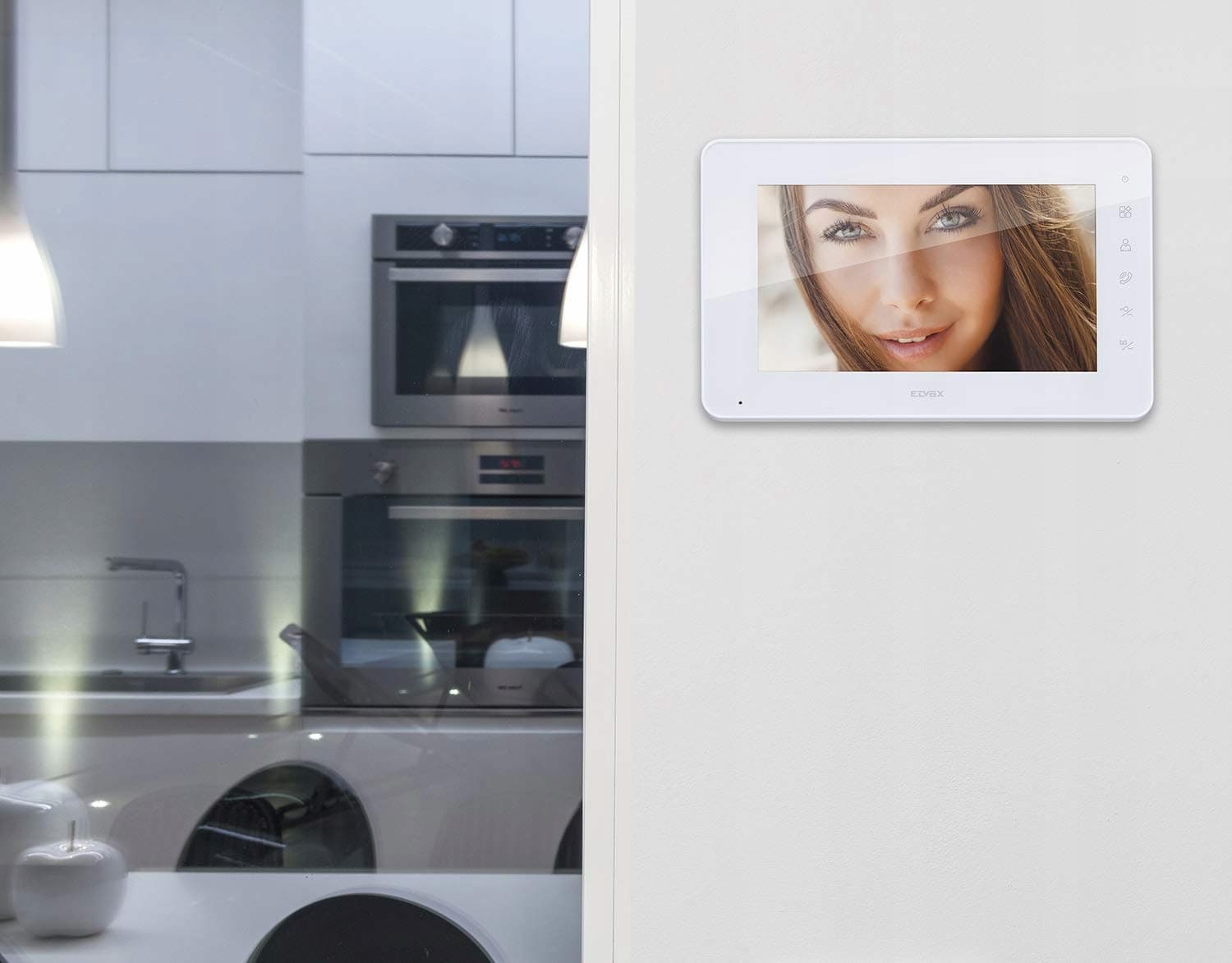 Wideodomofon składający się z 2 bezdotykowych 7-calowych wideodomofonów LCD z klawiaturą pojemnościową, 1 audio/wideo stacji drzwiowej z 2 przyciskami i osłoną przeciwdeszczową, 2 zasilaczy prądu stałego 24 V z wymiennymi wtyczkami (EU, BS, US, AU), kompletny z uchwytami montażowymi do montażu natynkowego