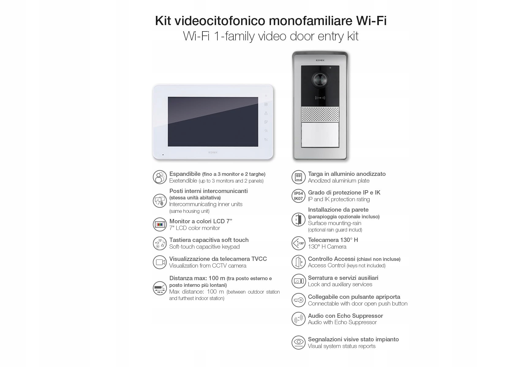 Zestaw wideodomofonowy VIMAR K42930 zawiera zestaw głośnomówiący wideo domofonu LCD 7 cali, tabliczkę dzwonkową RFID z 1 przyciskiem i ochroną przed deszczem, zasilacz DIN, 1 rodzina