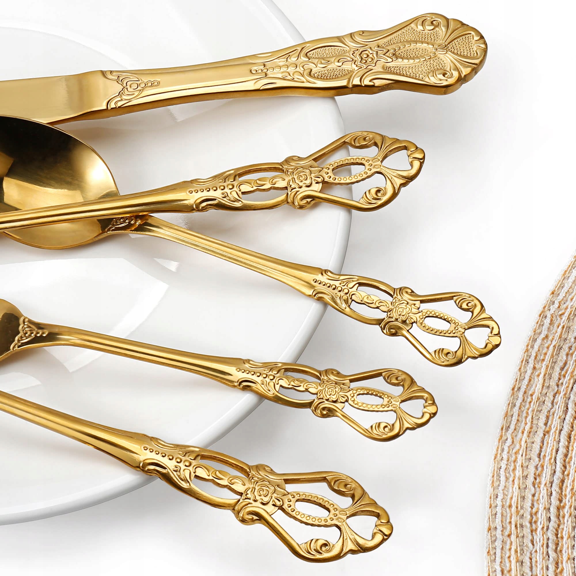 Zestaw sztućców, złote sztućce 20-elementowe, zestaw sztućców dla 4 osób ze stali nierdzewnej, sztućce w stylu vintage pałacowym, złote, nadające się do zmywarki i wysoko polerowane, zestaw sztućców na każdą okazję, tłoczone uchwyty