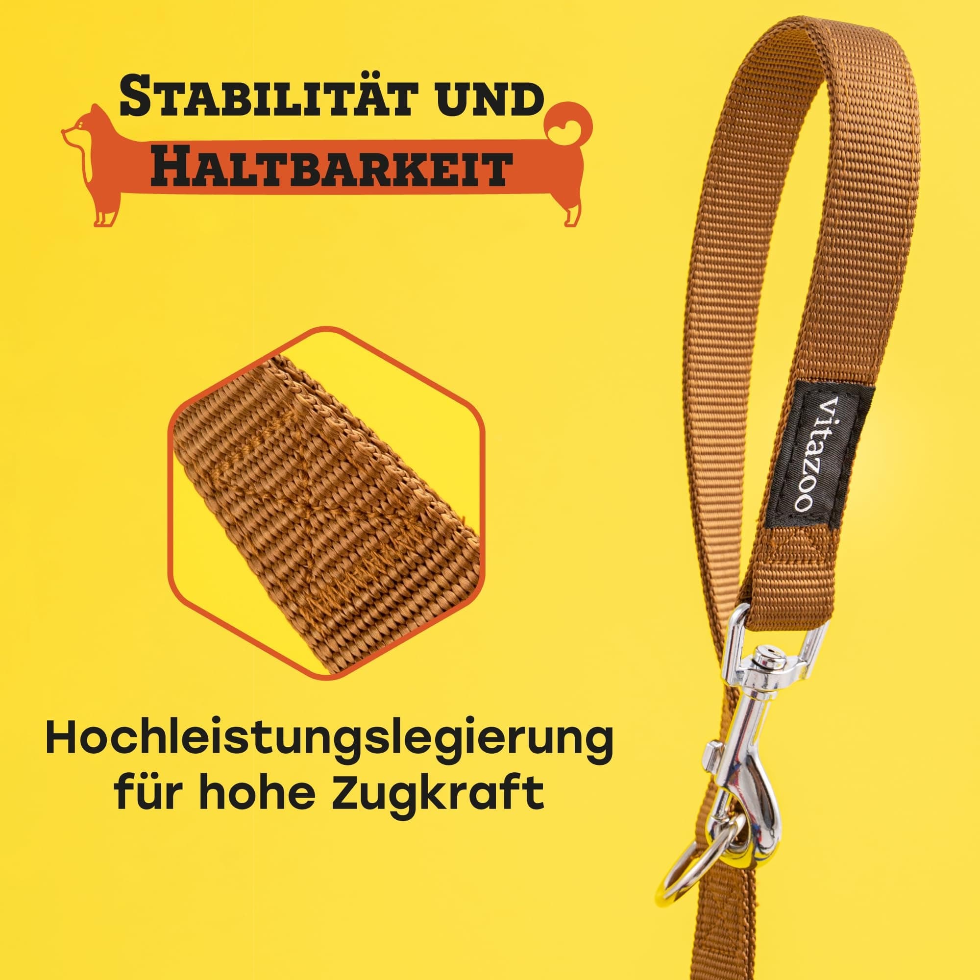 ODPOWIEDNIA DLA RÓŻNYCH RAS PSÓW: Smycz vitazoo jest wykonana z bardzo wytrzymałego materiału, dzięki czemu nadaje się również dla większych i silniejszych ras psów. Nie stanowi również problemu dla szczeniąt.