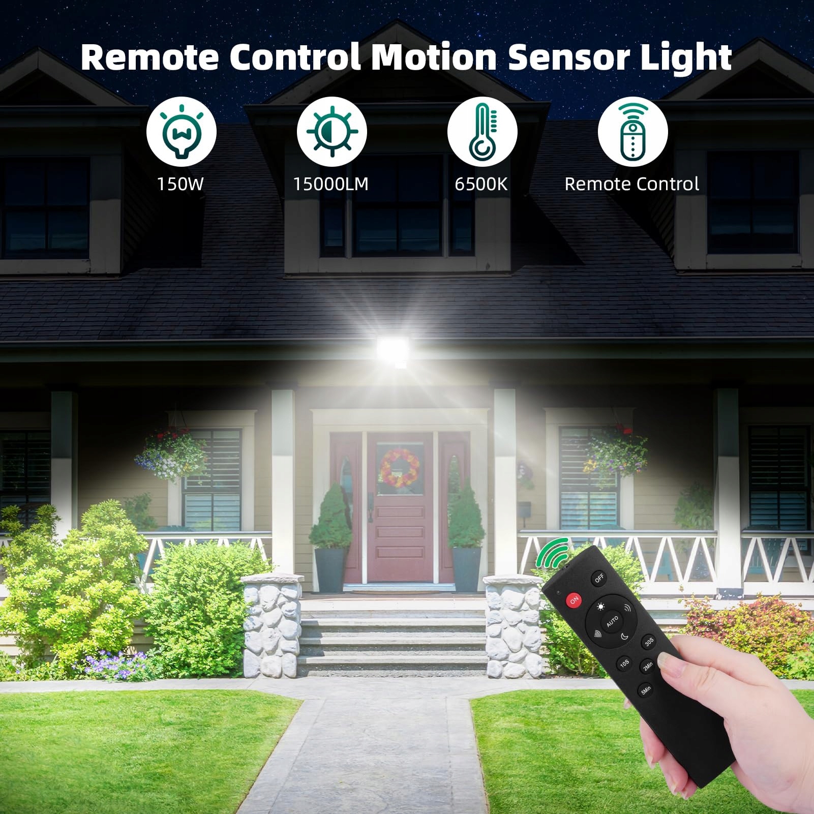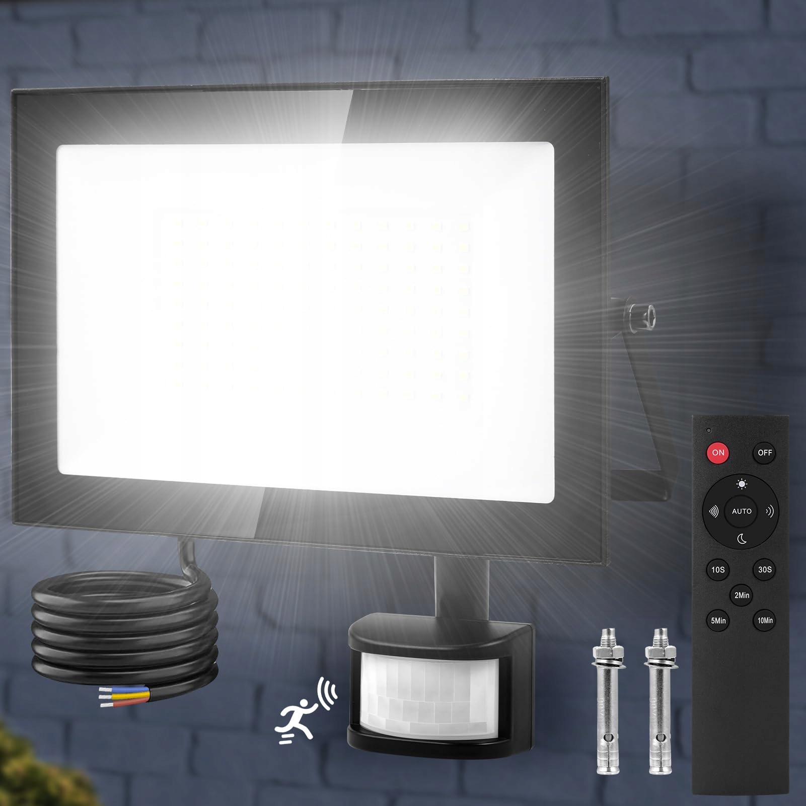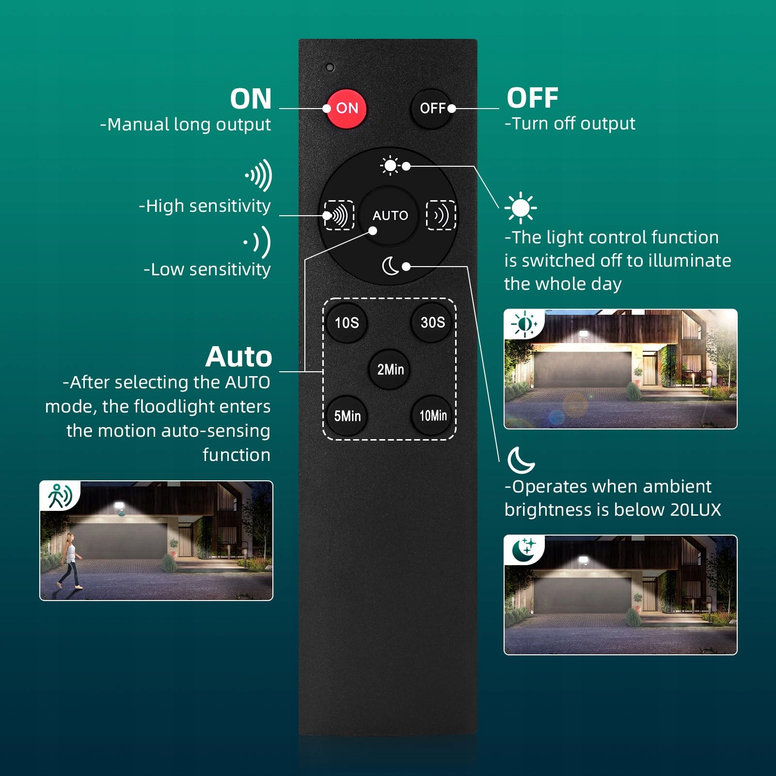 【Reflektor LED z pilotem】 Najnowszy reflektor LED jest dostarczany z pilotem, który pozwala łatwo włączać i wyłączać światło zdalnie, bez konieczności wspinania się po drabinie, aby ustawić czujnik. Możesz łatwo ustawić tryb ciągłej pracy/tryb czujnika ruchu PIR (dzień/noc), czułość wykrywania (maksymalny zasięg wykrywania do 10 m) oraz czas świecenia w trybie czujnika (10S/30S/2 Min/5min/10min).