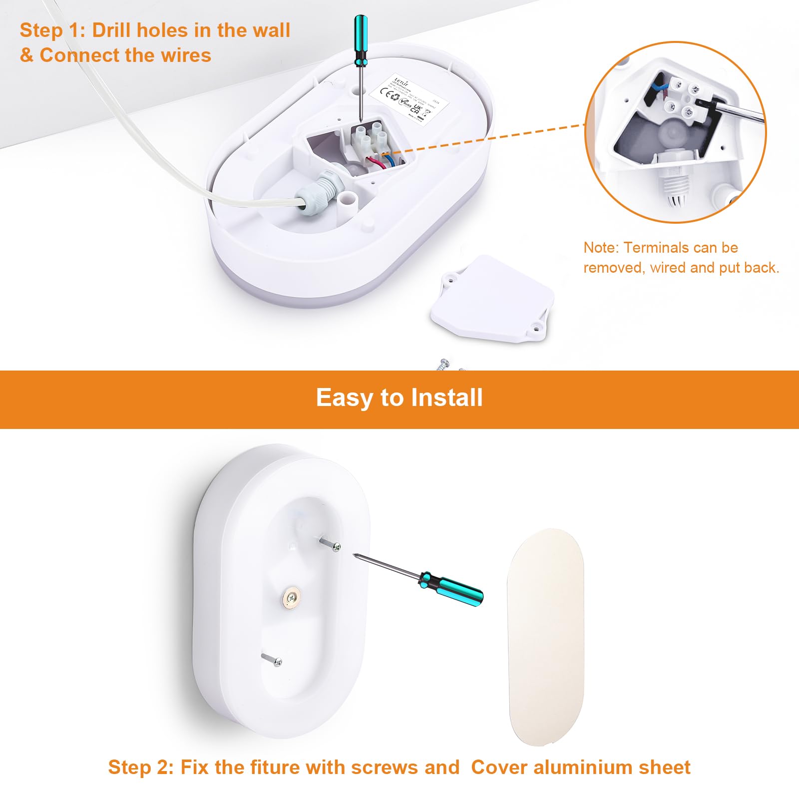 【Łatwa instalacja i trwałość】Dzięki wysokiej jakości materiałowi PC i wodoodporności IP65. Nasze lampy ścienne LED mają żywotność ponad 30 000 godzin. Wyposażamy nasze owalne lampy w wodoodporną puszkę przyłączeniową z zaciskami kablowymi, co ułatwia i zabezpiecza instalację.