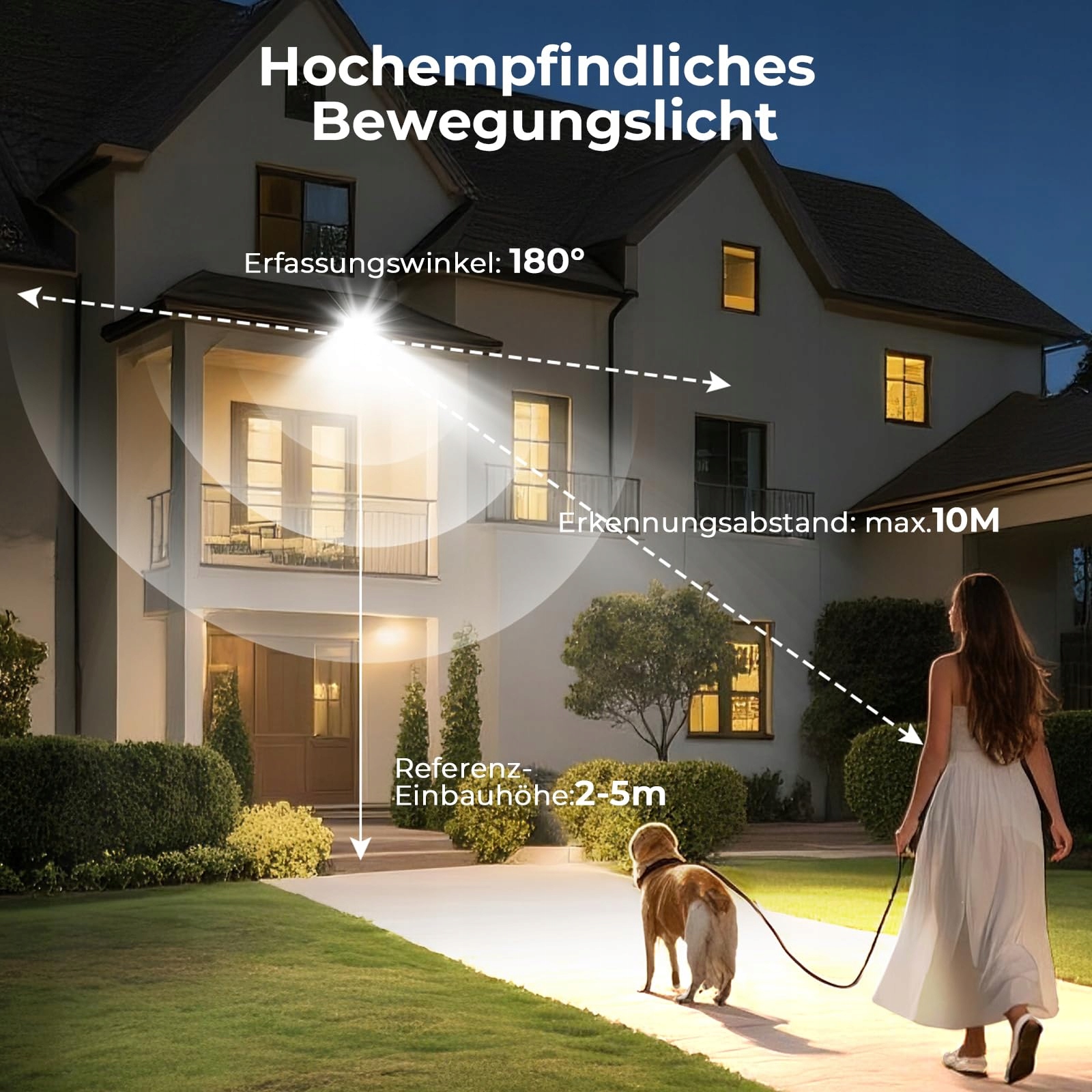 【2026 Ulepszony czujnik PIR】Nowo zmodernizowany czujnik PIR: wyższa czułość; lampa zewnętrzna z czujnikiem ruchu 30% powiększony zakres wykrywania dzięki zakrzywionym głowicom czujnika, natychmiastowe ultra jasne oświetlenie dzięki wykrywaniu podczerwieni, zdalna regulacja zasięgu i czasu działania.