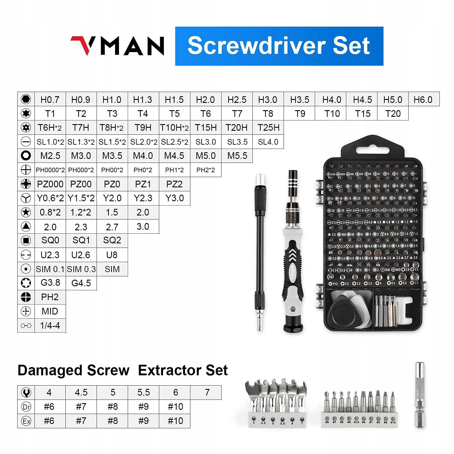 Zestaw narzędzi precyzyjnych 145 w 1: Zestaw mini narzędzi naprawczych VMAN zawiera 109 mini bitów wkrętakowych, 10 bitów do usuwania uszkodzonych śrub oraz 26 narzędzi dźwigowych. Zaspokaja potrzeby codziennego użytku domowego. Spełnia wszystkie Twoje wymagania dzięki zestawowi narzędzi dla precyzyjnych mechaników.