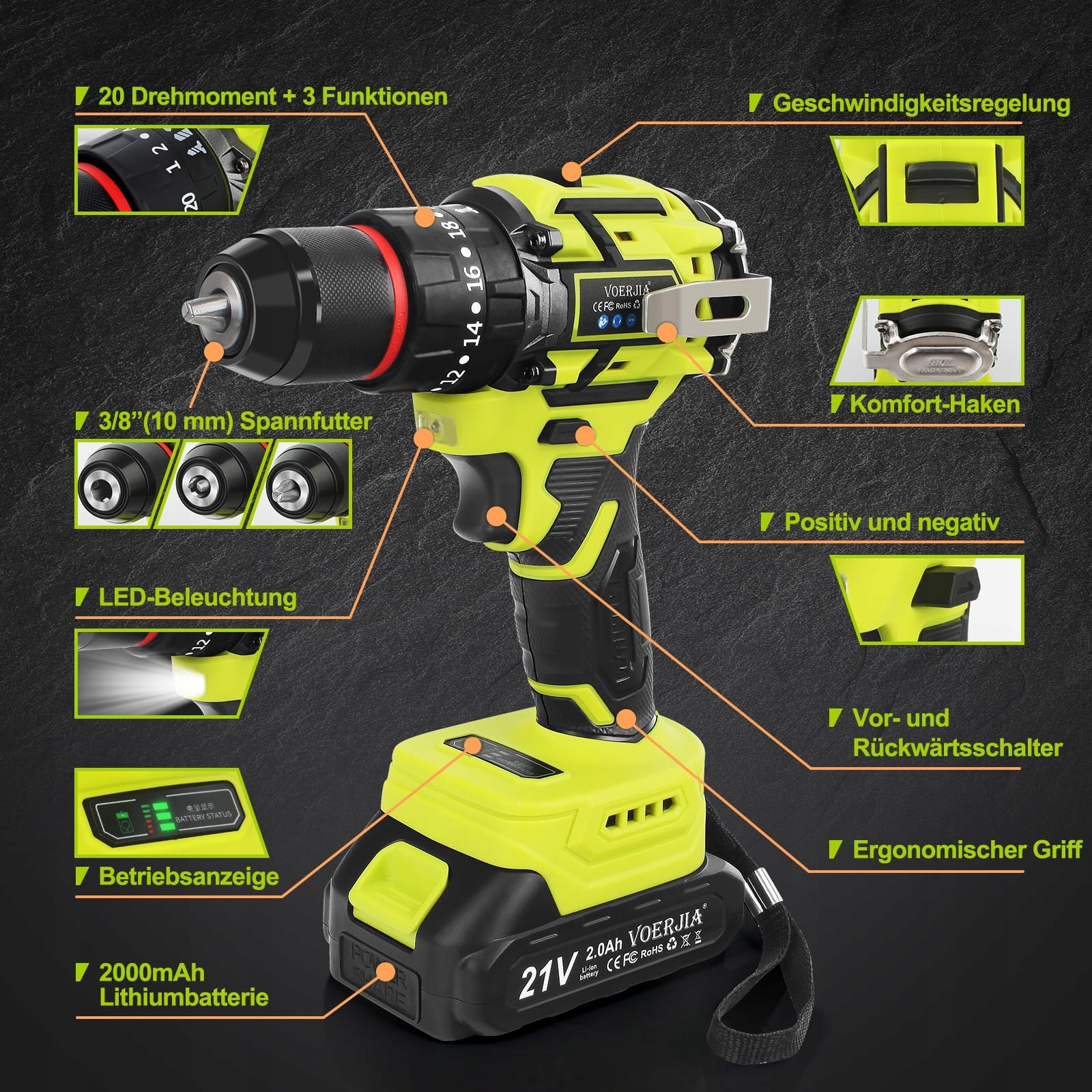 VOERJIA 21V Zestaw wkrętarki akumulatorowej, bezszczotkowy młotowiertarka z 2*2000 mAh akumulatorem, uchwyt wiertarski 3/8', 20+3 moment obrotowy, Max 65 N.m wiertarka akumulatorowa, światła LED i 2-biegowa, 46 sztuk akcesoriów do elektronarzędzi