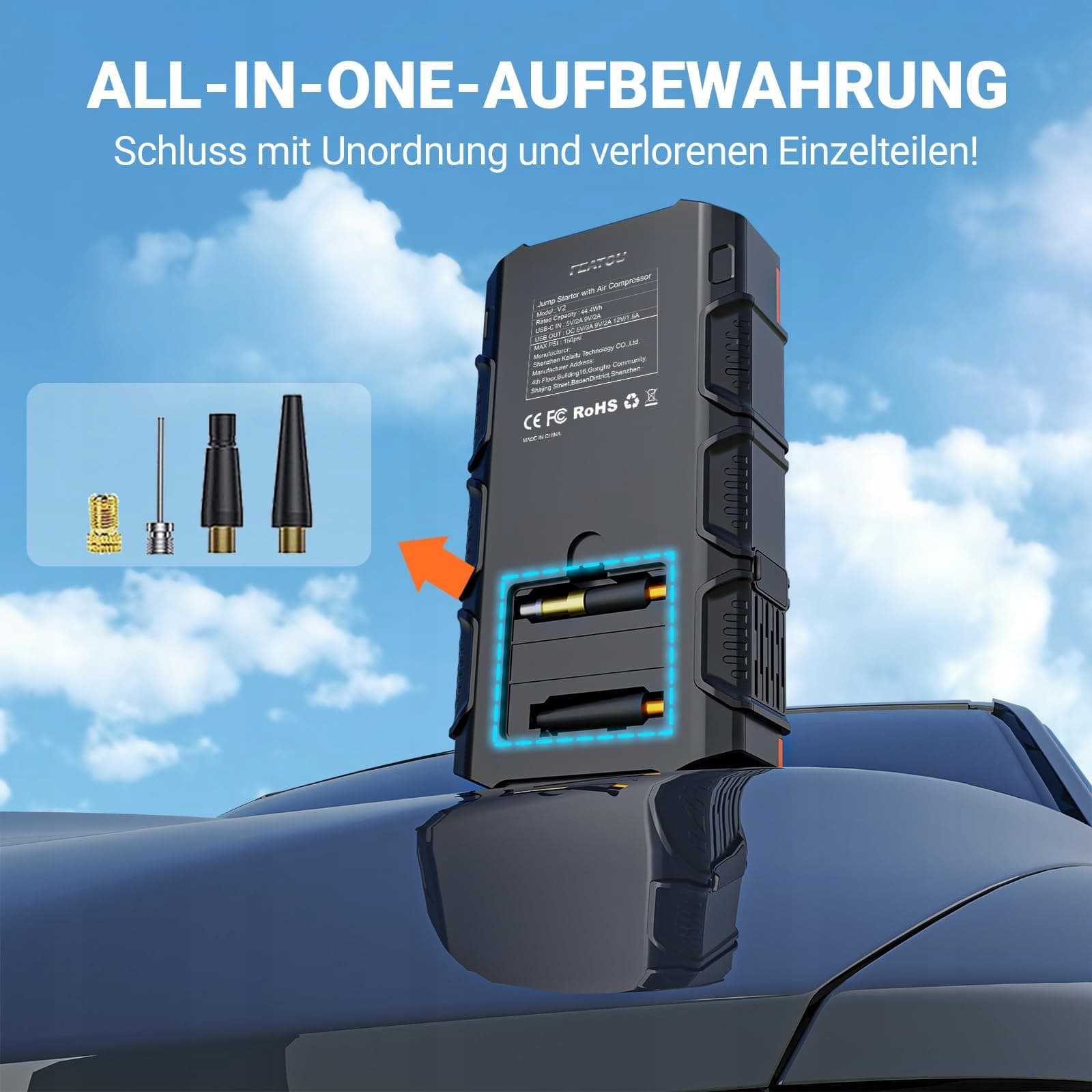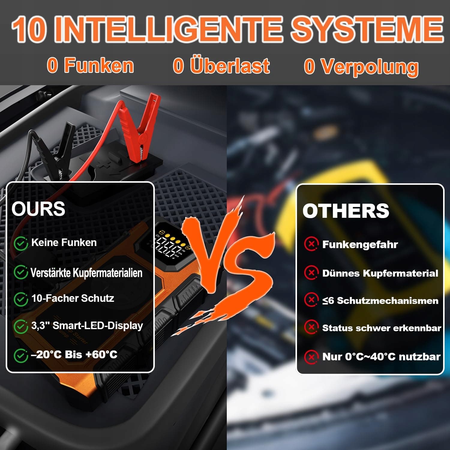 【Ulepszona powerbank rozruchowa】Łączy w sobie potężną powerbank rozruchową do samochodów (niezawodna przy rozruchu zimą do -20°C!), kompresor powietrza do auta (maksymalnie 10 bar) oraz powerbank w jednym urządzeniu; wytrzymała obudowa z ABS jest odporna na uderzenia i wytrzymuje ekstremalne temperatury od -20°C do 60°C – nawet podczas mroźnych zimowych dni bezproblemowy start! Jaskrawy pomarańczowy kolor zapewnia szybkie zauważenie także w nocy; pożegnaj się z nieporęcznym sprzętem – urządzenie 3 w 1 dla efektywnych podróżników, idealne na motocyklowe przygody lub wycieczki samochodowe
