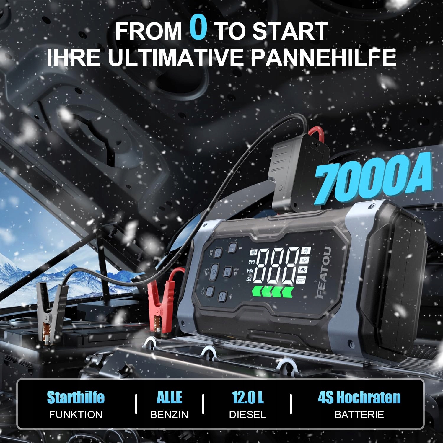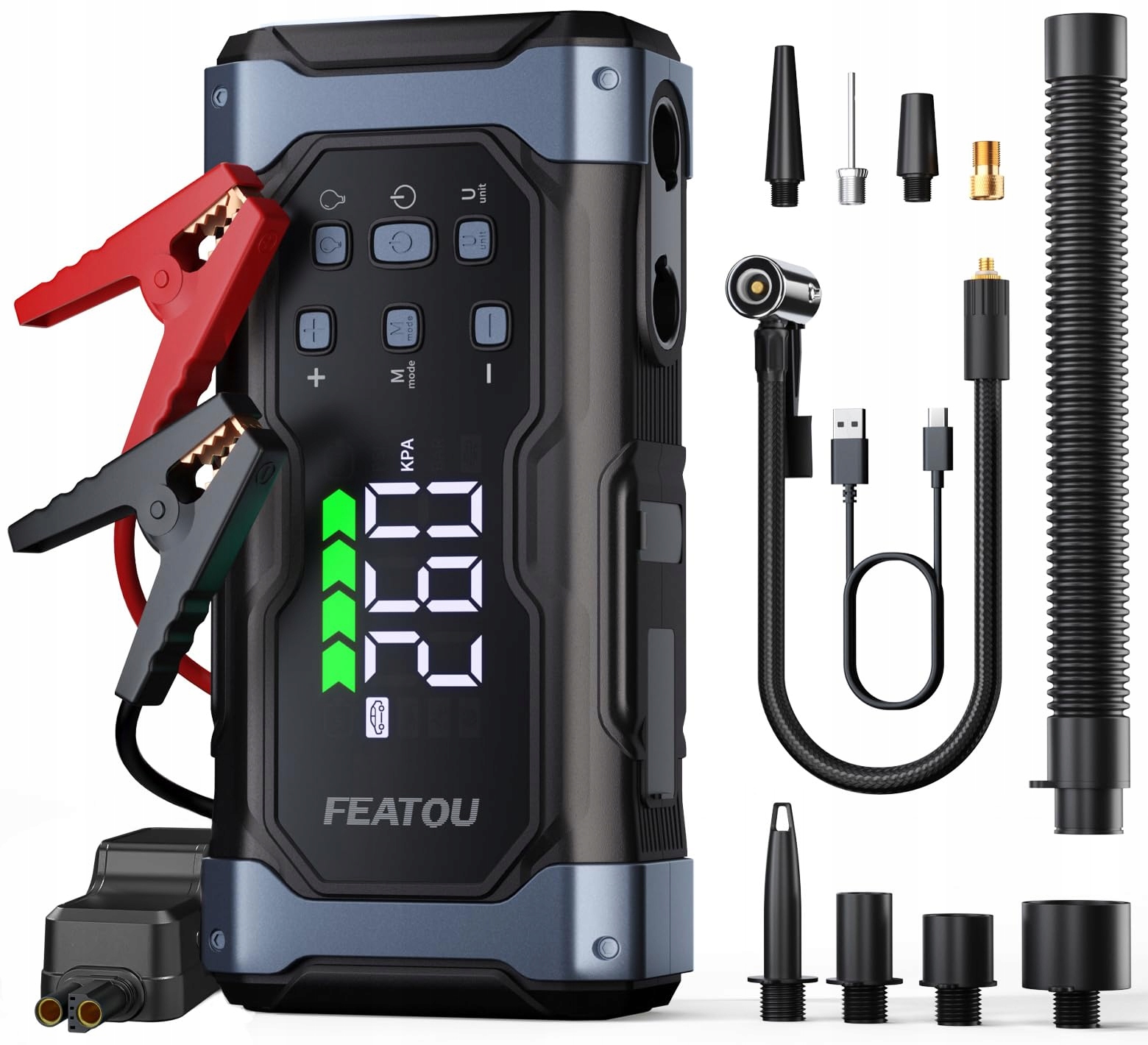 【150PSI Powerbank do rozruchu samochodu z kompresorem】Nasza powerbank do rozruchu samochodu zawiera 150PSI/10BAR zimowy kompresor samochodowy, który nawet w mroźnych temperaturach w kilka minut napompuje opony samochodowe od 0 do 36PSI – idealny na zimowe awarie z pustymi oponami! Z 4 wszechstronnymi dyszami dla samochodów, rowerów, piłek i sprzętu pływackiego, plus inteligentne ustawienia wstępne, wykrywanie ciśnienia i automatyczne wyłączanie – bezpieczne i niezawodne nawet w mrozie. Nie martw się więcej o problemy z ciśnieniem w oponach zimą! 60cm przedłużony wąż do pompowania ułatwia pompowanie w niskich temperaturach (maksymalny czas pracy ciągłej do 10 minut, aby uniknąć przegrzania)