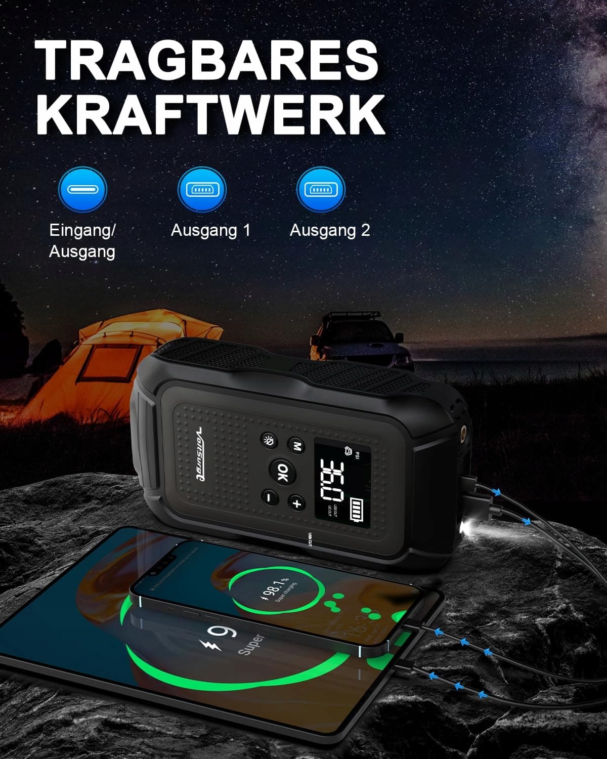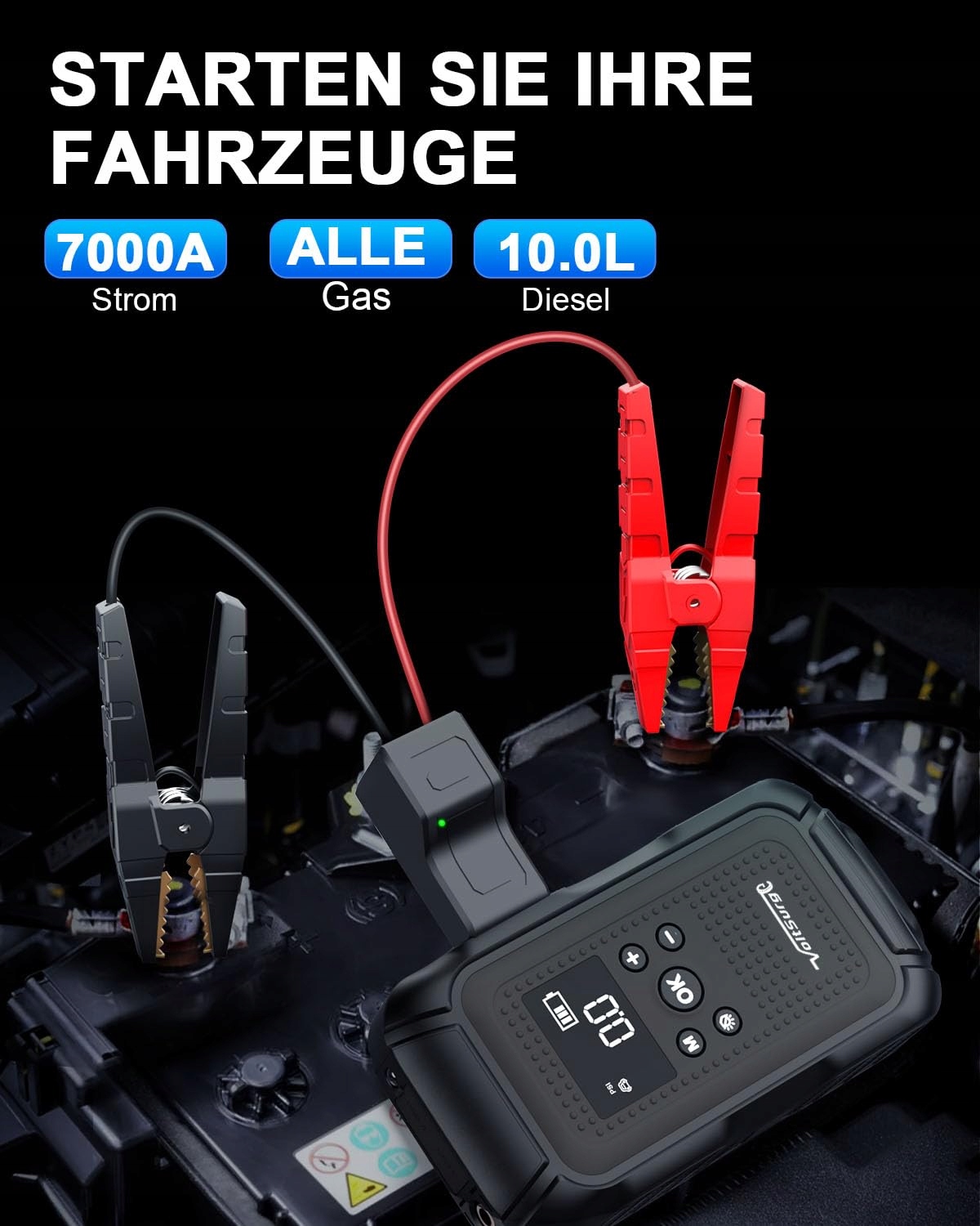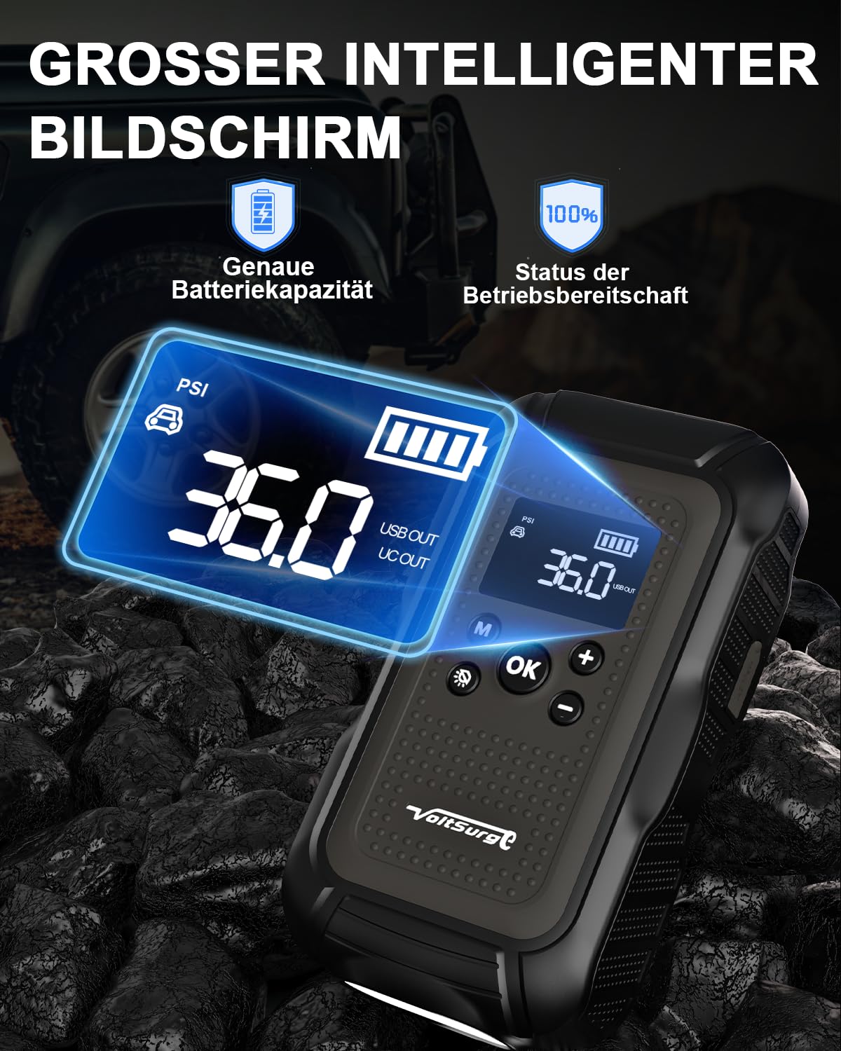 Urządzenie do awaryjnego rozruchu VoltSurge dla samochodów: To 4-w-1 urządzenie awaryjne łączy w sobie potężny kompresor powietrza (150 PSI), urządzenie do rozruchu 7000A, powerbank i latarkę LED w kompaktowym designie. Uruchamia natychmiastowo pojazdy 12V, w tym duże silniki Diesla do 10.0 litrów pojemności, i jest odpowiednie dla SUVów, ciężarówek, łodzi i więcej