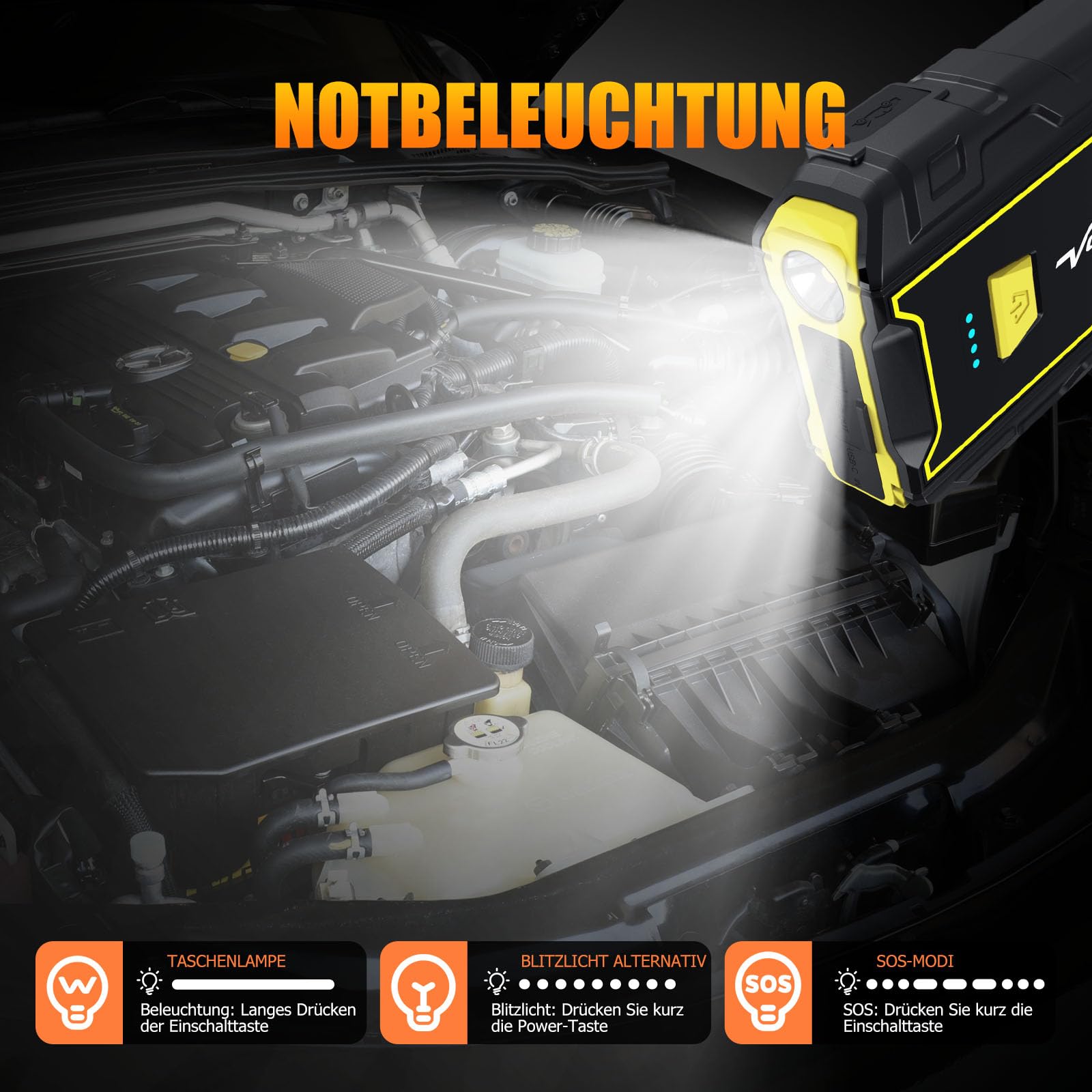 🚗【Oświetlenie】Rozrusznik posiada 3 tryby światła LED: światło stałe, światło błyskowe, SOS. Jest to idealne narzędzie do codziennego użytku, podróży, wycieczek na świeżym powietrzu, sytuacji awaryjnych
