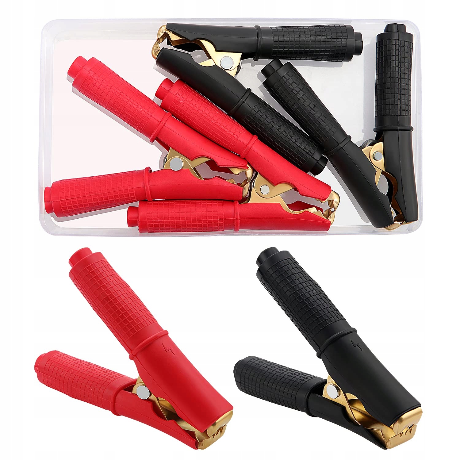 Opakowanie zawiera: 2 sztuki czarnych zacisków do kabli rozruchowych, 2 sztuki czerwonych zacisków do kabli rozruchowych.