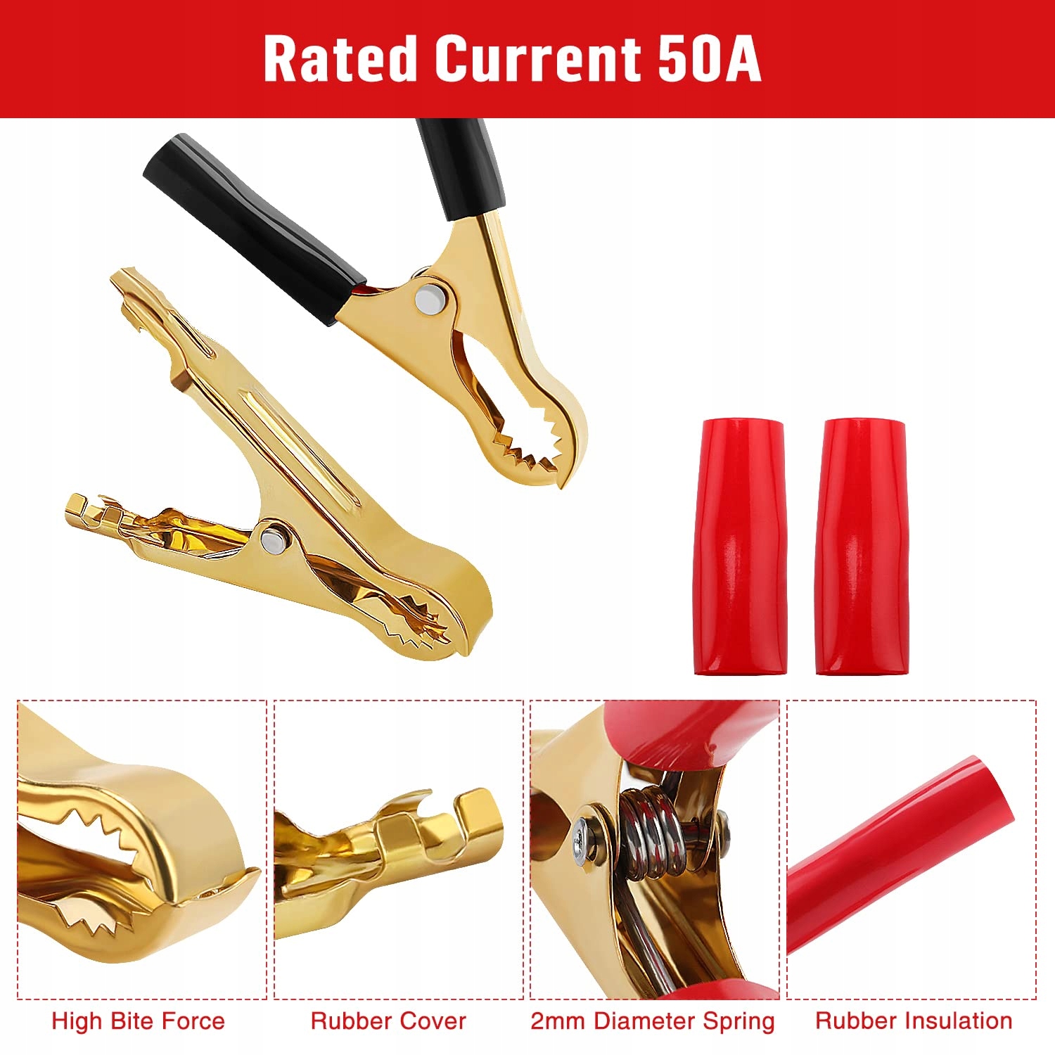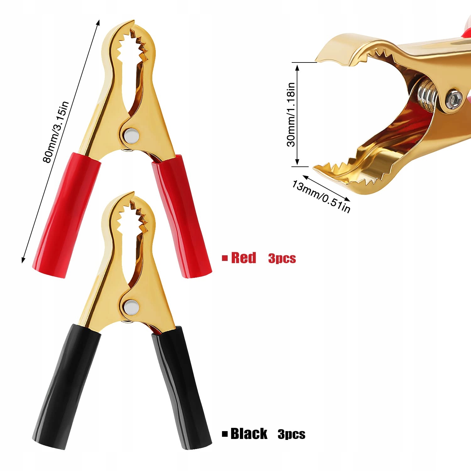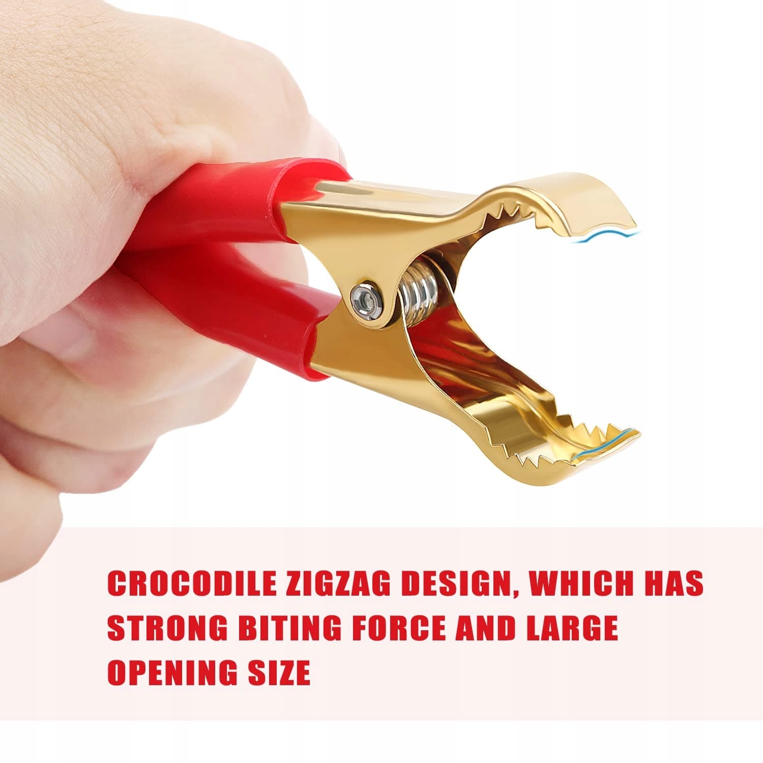 Łatwe do połączenia: czarny i czerwony pasujący, łatwo rozróżnić biegun dodatni i ujemny, zygzakowaty design krokodyla, silna siła zacisku i duży rozmiar otwarcia.