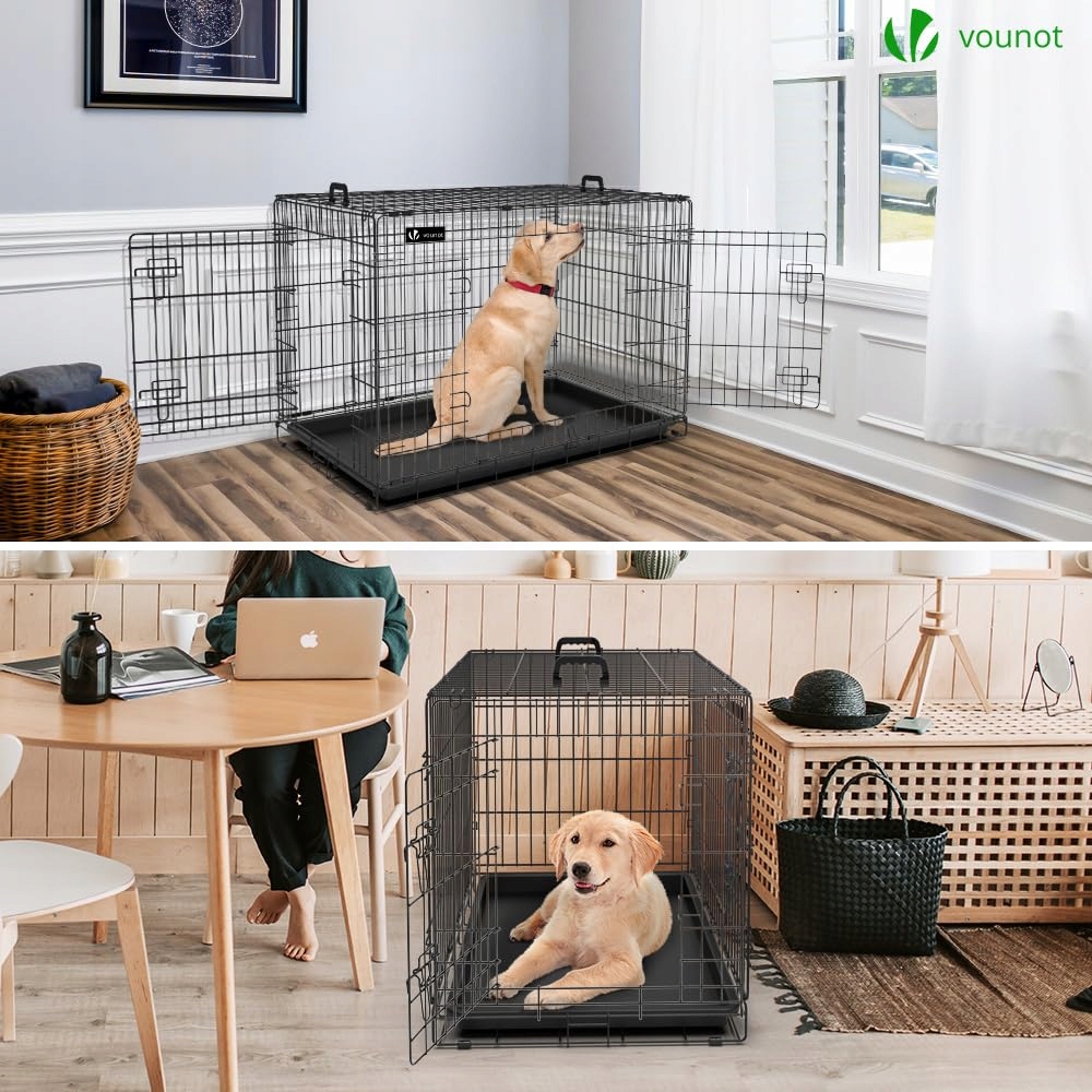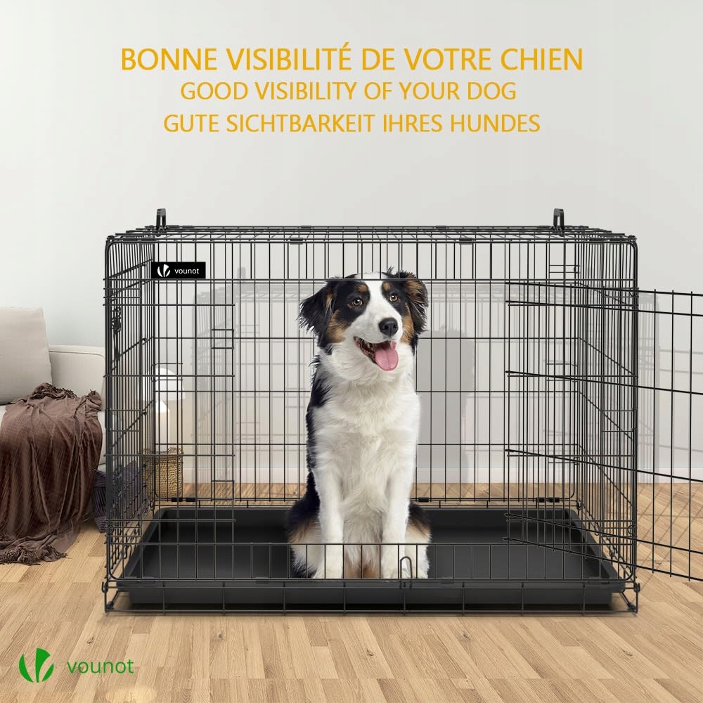 VOUNOT Składana klatka dla psa z pokrowcem, klatka transportowa do samochodu z podwójnymi drzwiami, 2 uchwytami i tacką, XL 107x70 x78 cm, Czarna