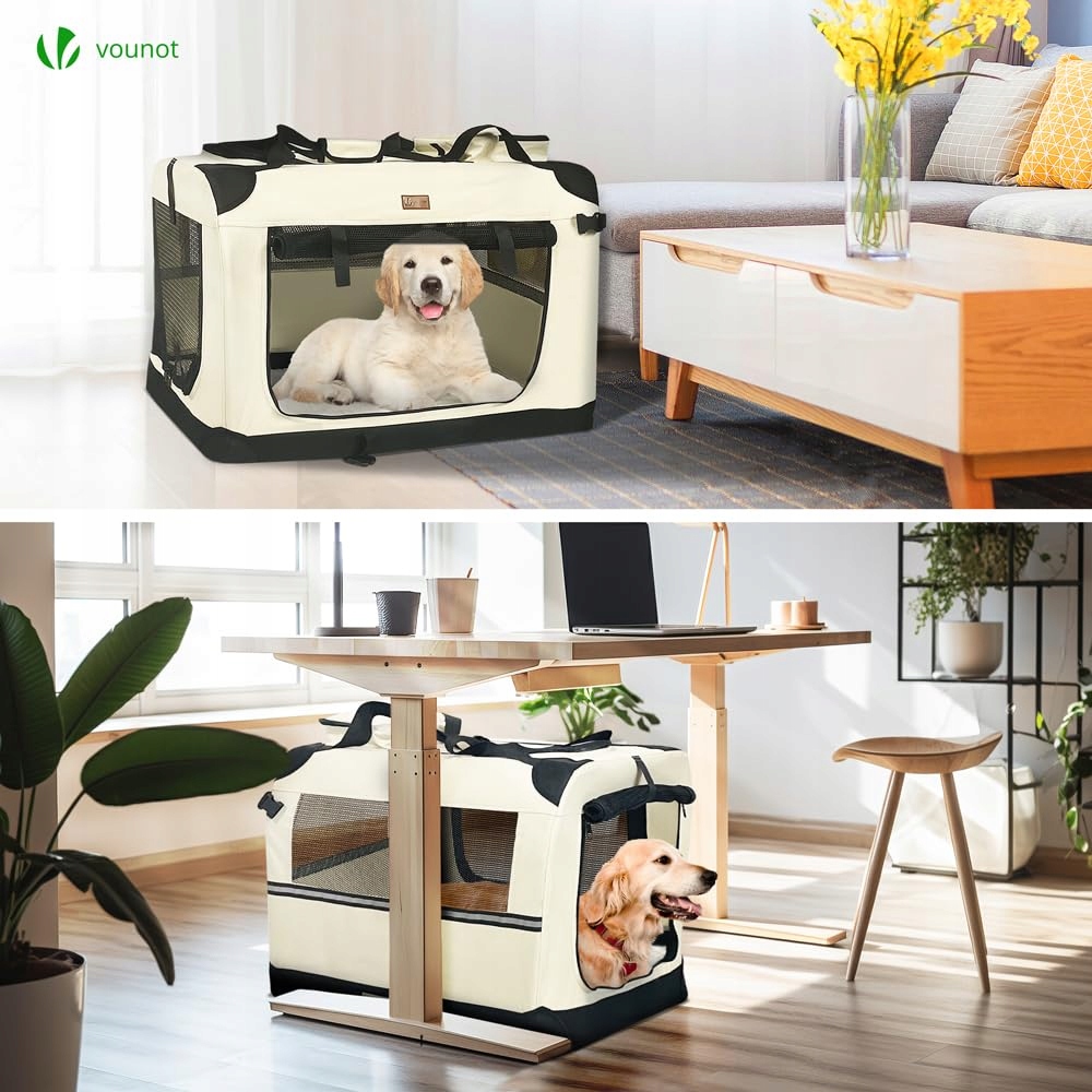 VOUNOT składana klatka dla psa, transporter dla kota i psa, torba dla psa, tkanina Oxford, siatka, oddychająca, przenośna, metalowa rama, z uchwytami, kieszeniami, 82x60x60cm XL, beżowa