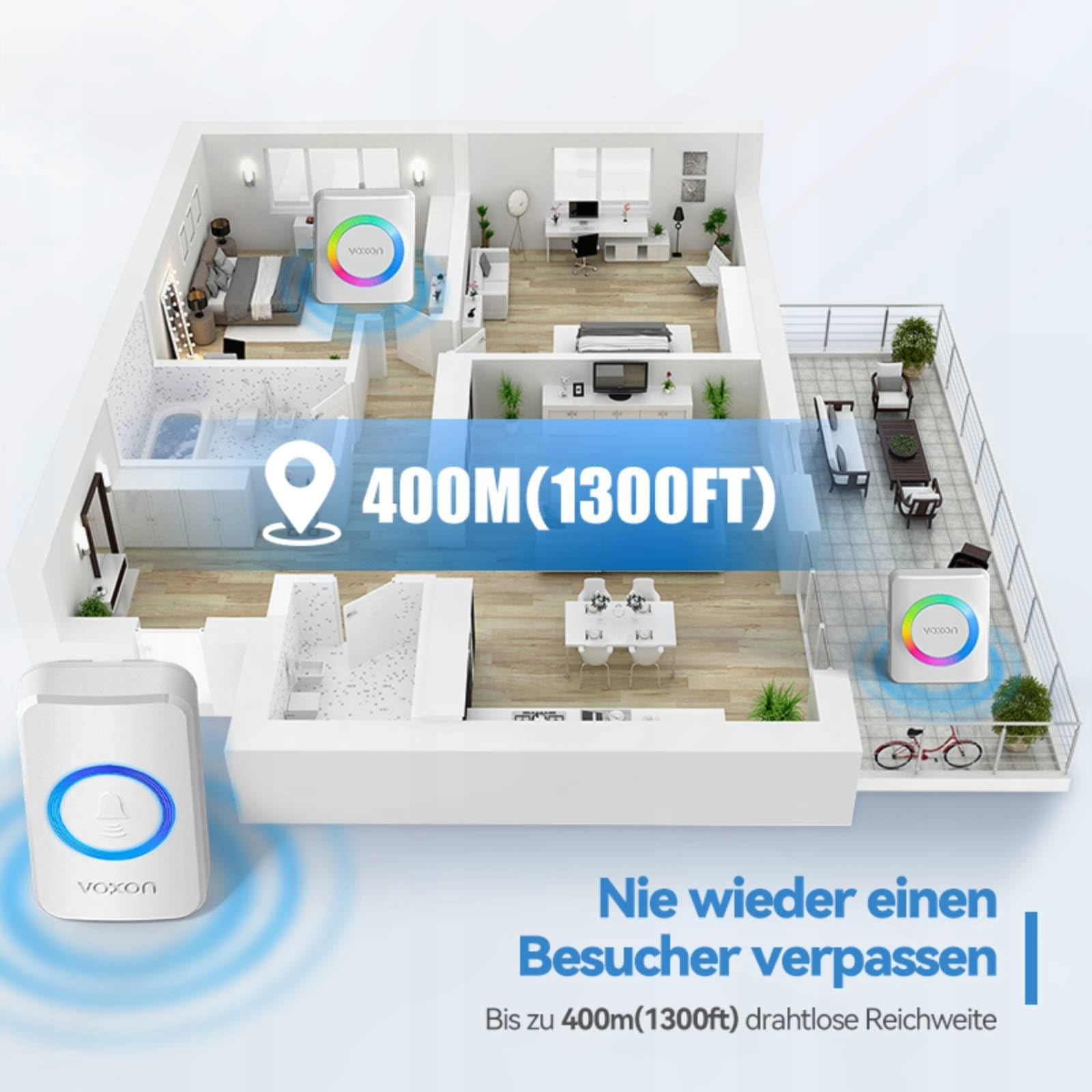 【Zasięg pracy bezprzewodowej 400 m】 Bezprzewodowy dzwonek do drzwi VOXON o dużym zasięgu ma gwarantowaną niezawodność do 400 m (1300 ft) na zewnątrz. Silny, stabilny sygnał radiowy nigdy nie jest zakłócany przez inne urządzenia elektroniczne. Daje to pewność, że zostaniesz powiadomiony, gdy przybędzie gość. Nawet jeśli masz duży dom z wieloma pokojami, ten dzwonek do drzwi został zaprojektowany tak, aby dźwięk dzwonka dotarł do Ciebie