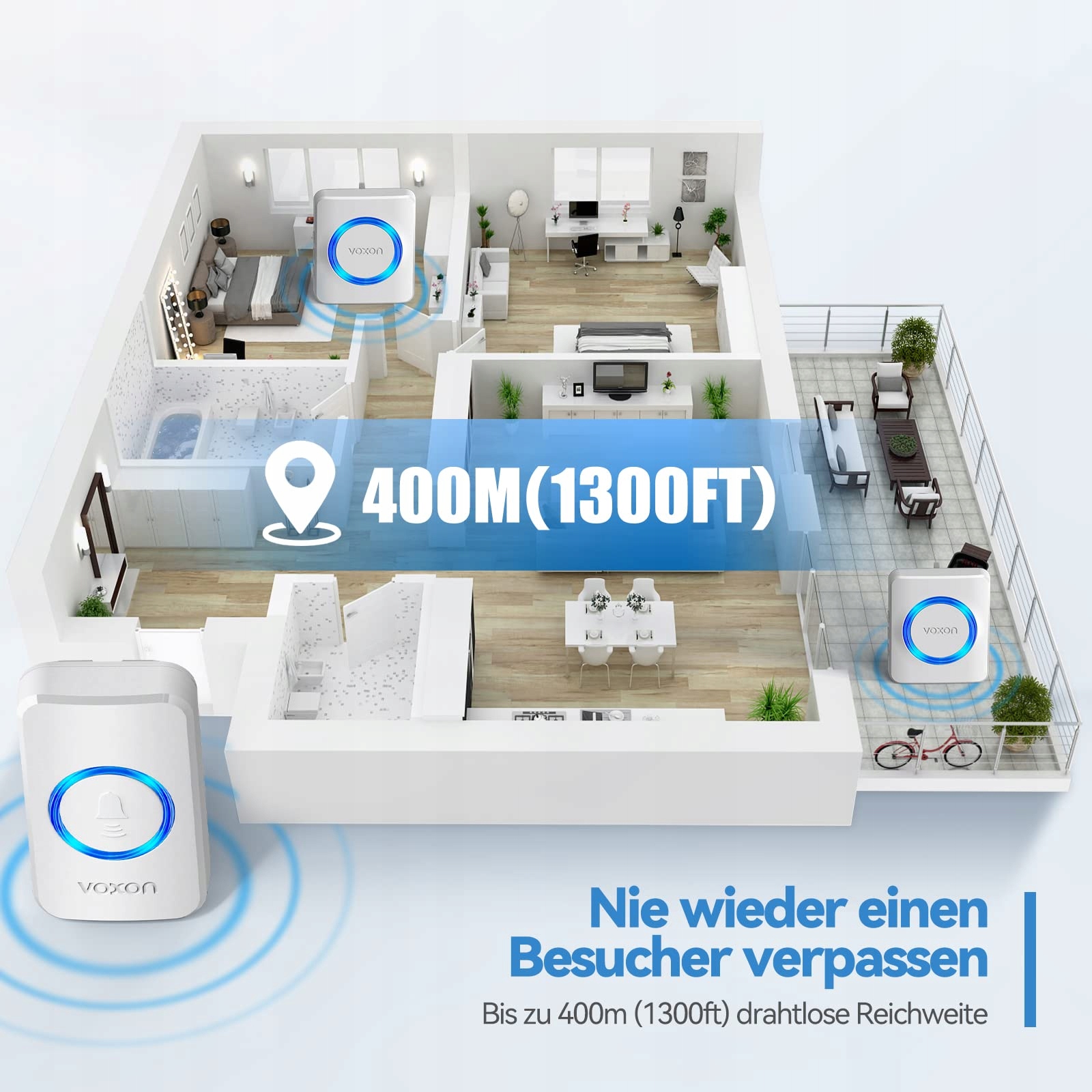【400 m ultra-długi zasięg pracy bezprzewodowej】 Bezprzewodowy dzwonek do drzwi VOXON o dużym zasięgu może działać na odległość do 400 m w otwartym terenie. Nie może być zakłócany przez inne pobliskie urządzenia bezprzewodowe, silny i stabilny sygnał radiowy zapewnia, że nigdy więcej nie przegapisz gości, nawet jeśli jesteś w dużym domu z wieloma pomieszczeniami. Niezależnie od tego, czy to piętro, czy piwnica
