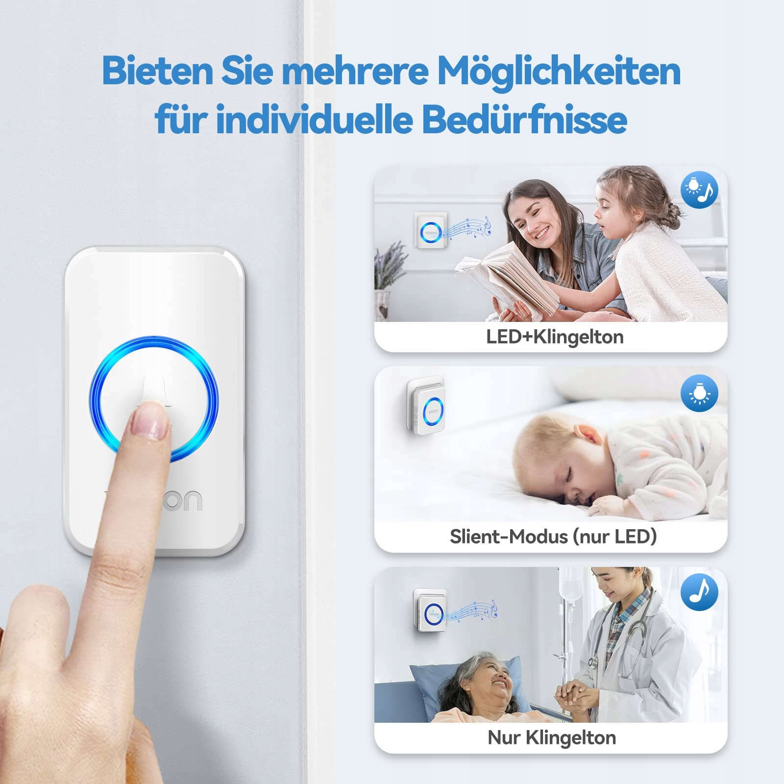 【3 tryby pracy】 Bezprzewodowe dzwonki do drzwi VOXON mają 3 opcjonalne tryby pracy (tylko LED, dzwonek, LED i dzwonek), które mogą nieskończoność wyciszać dzwonek bezprzewodowy. Wyrazista niebieska funkcja LED to dyskretny, ale skuteczny wizualny alarm, który uzupełnia wybraną melodię w głośnych środowiskach lub ostrzega Cię, gdy dzwonek nie może być usłyszany. Może również alarmować osoby z ograniczonym słuchem lub gdy dźwięk dzwonka jest tymczasowo niepożądany
