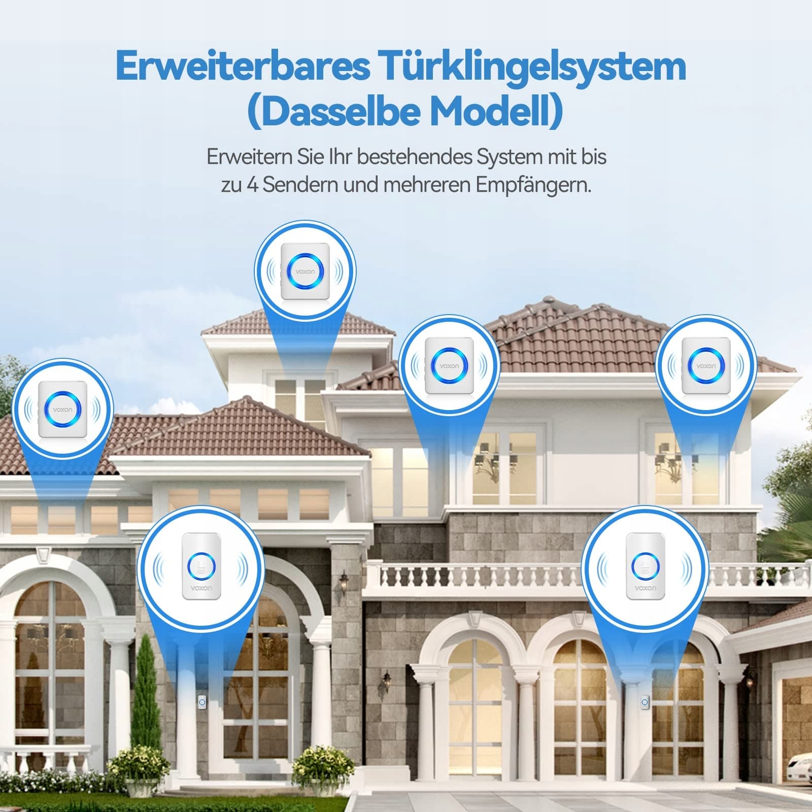 【Rozszerzalny system dzwonków】 Rozszerz swój system dzwonków do drzwi o maksymalnie 4 nadajniki i wiele odbiorników (tylko ten sam model dzwonka VOXON), zbuduj własny prosty system alarmowy