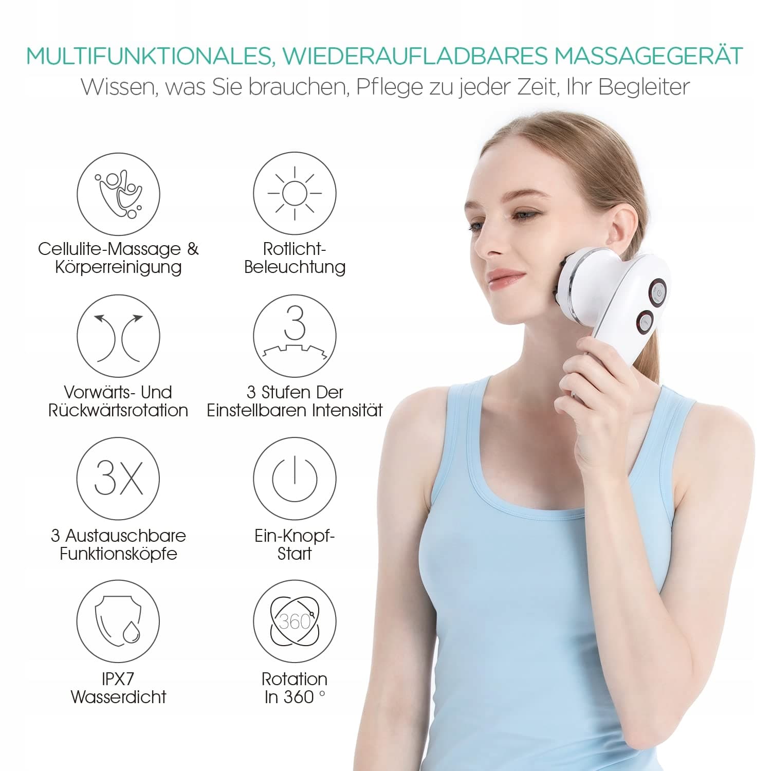 3 GŁOWICE WIELOFUNKCYJNE - Zawiera 1 x smukłą głowicę masującą, która może działać jako urządzenie do masażu twarzy/ręki/szyi/ciała; 1 x głowicę szczoteczki do oczyszczania twarzy i ciała; 1 x urządzenie do masażu antycellulitowego, aby usunąć tkankę tłuszczową i uformować ciało w bardziej jędrny kształt.