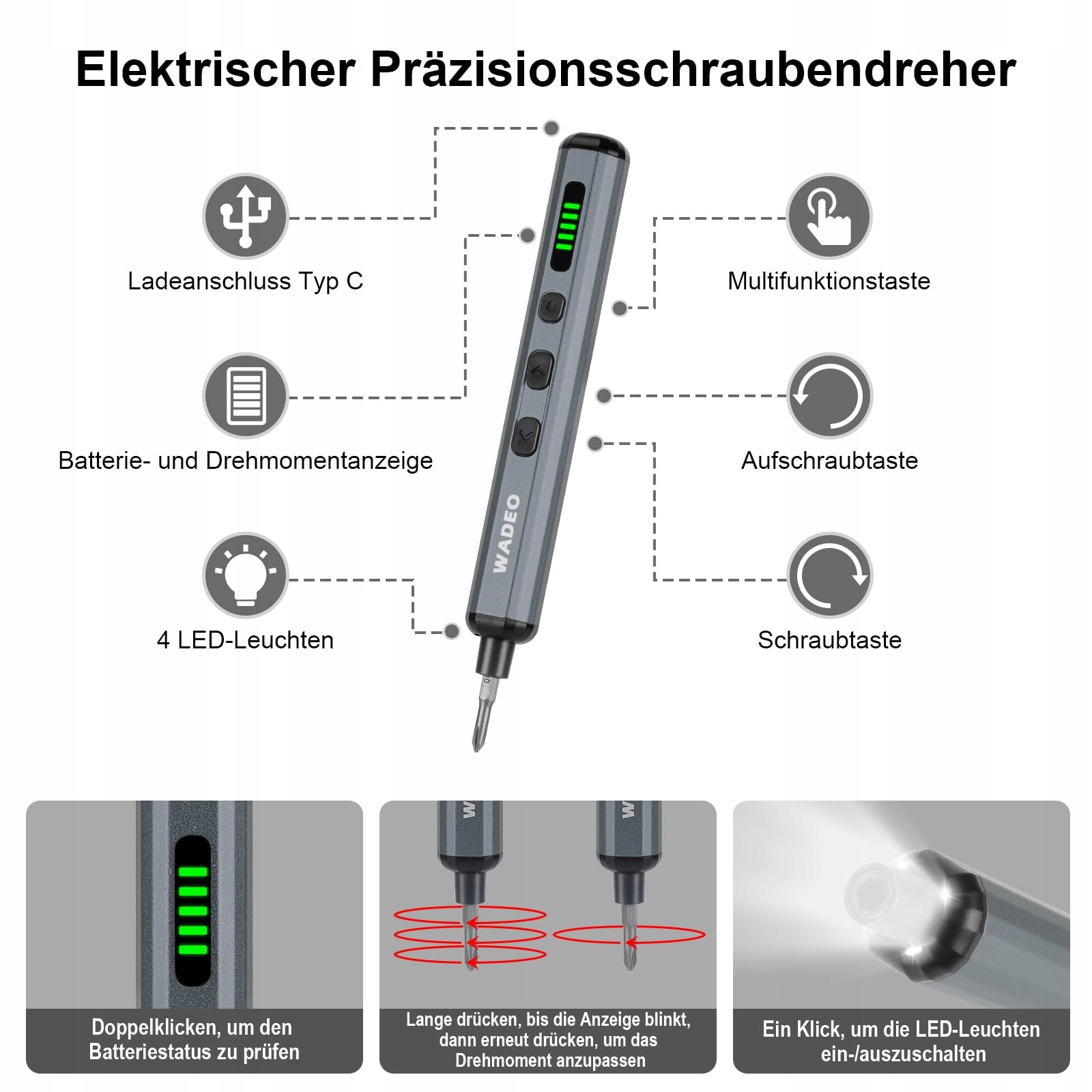 Zestaw precyzyjnych wkrętaków 82 w 1, idealny do wszystkich prac naprawczych – Przenośna wkrętarka elektryczna WADEO jest dostarczana z 64 bitami wkrętaków i różnymi innymi praktycznymi akcesoriami, dzięki czemu możesz łatwo poradzić sobie ze wszystkimi pracami naprawczymi. Utwardzona stal S2 zapewnia długą żywotność i bezpieczeństwo. Wysokiej jakości narzędzia zapewniają wysoką jakość pracy.