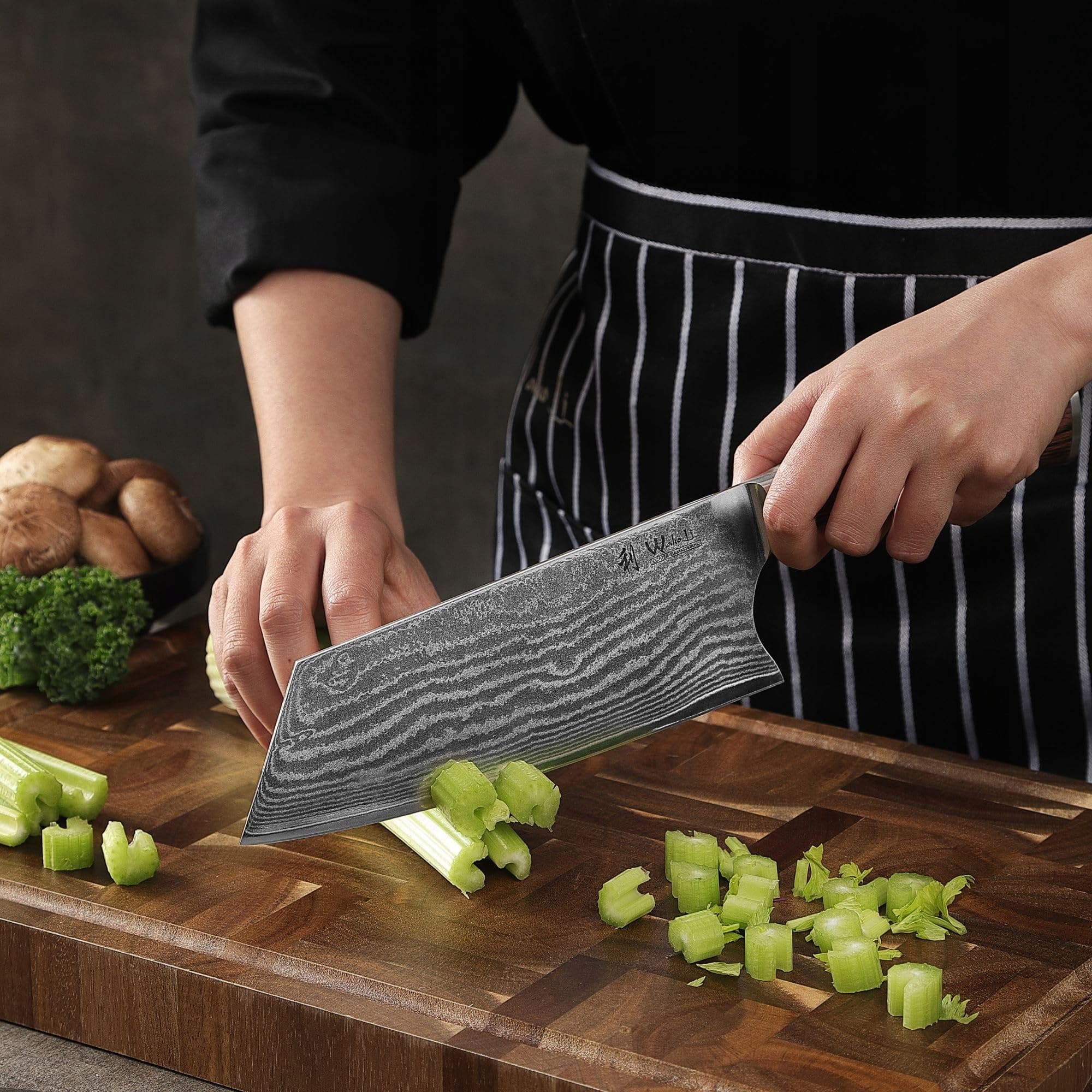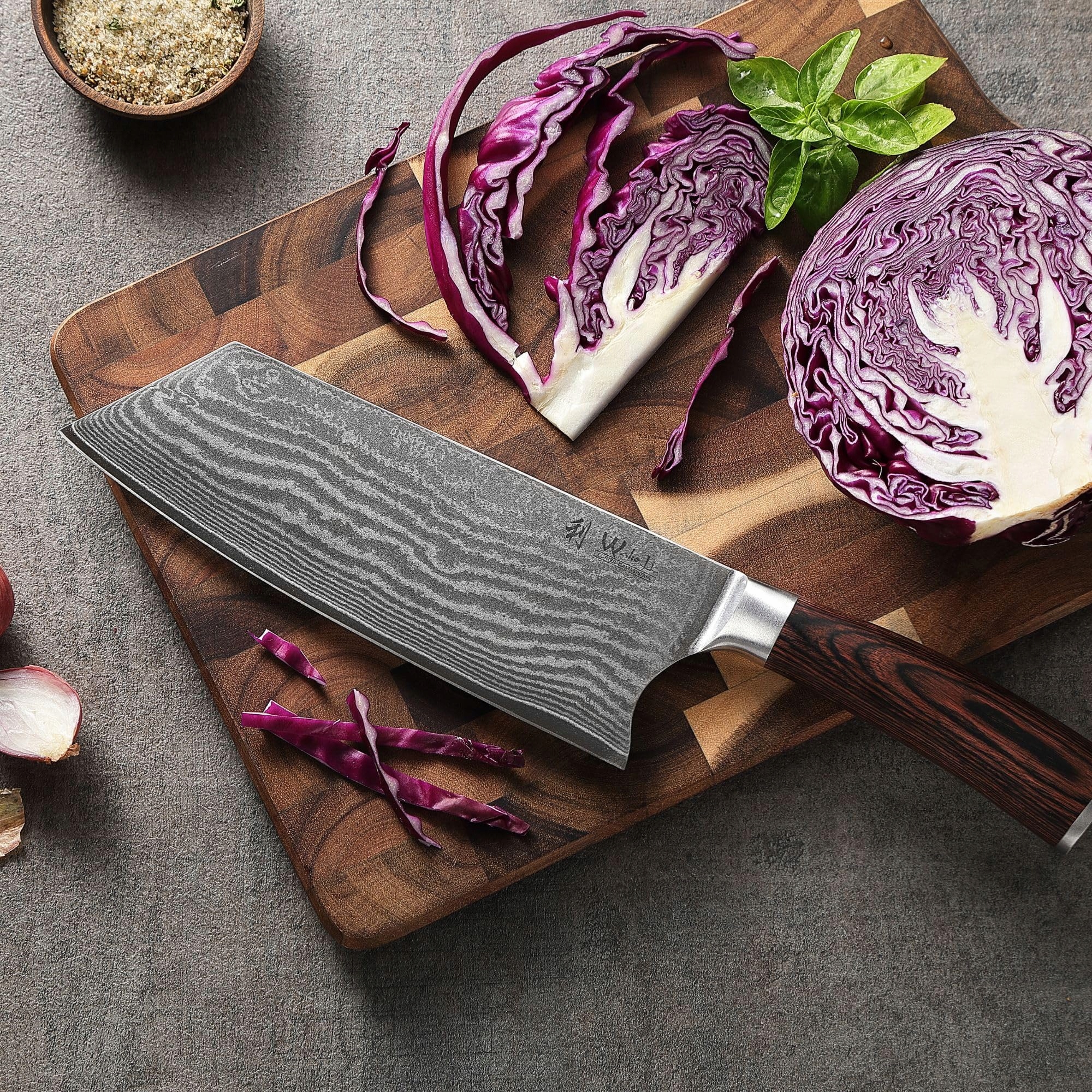 Premium nóż kuchenny Chai Dao z ostrzem 19 cm: Wakoli Edib Chai Dao ma całkowitą długość 33 cm (ostrze 19 cm) z 67 warstw japońskiej stali damasceńskiej z rdzeniem VG-10. Dzięki twardości 60±2 HRC nóż ten oferuje wyjątkową ostrość, trwałość i precyzję. Idealny do mięsa, warzyw, ziół i nie tylko.