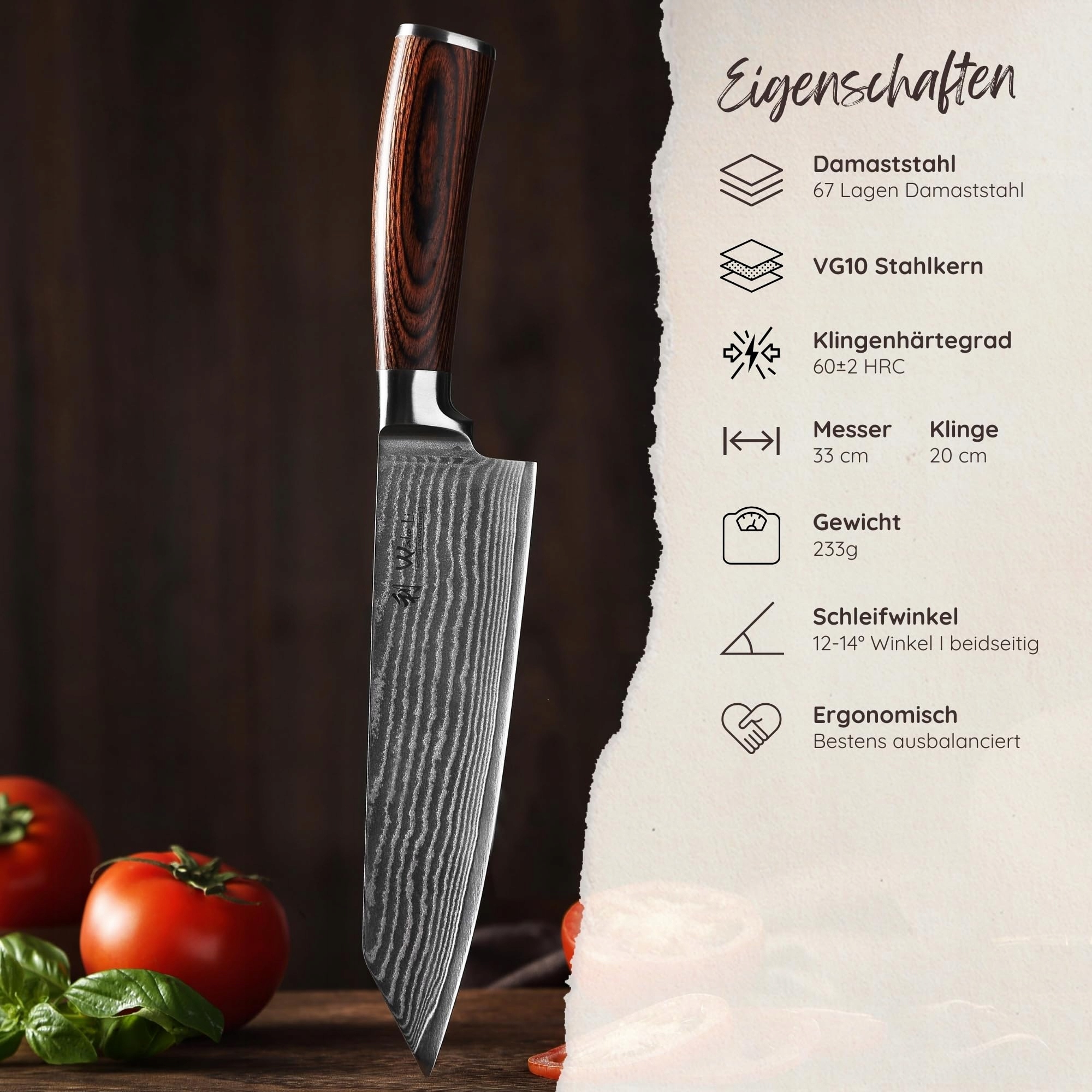 🔪 CECHY NOŻY - Profesjonalny nóż kuchenny Kiritsuke z uchwytem z drewna Pakkaholz ma całkowitą długość 33 cm, z czego ostrze ma 20 cm. Dzięki specjalnej geometrii ostrza idealnie nadaje się do parowania, filetowania mięsa, ryb i warzyw, a także do przygotowywania sushi i sashimi. Ten profesjonalny nóż kuchenny zachwyca swoją wyjątkową ostrością i zapewnia precyzyjne cięcie przez długi czas.
