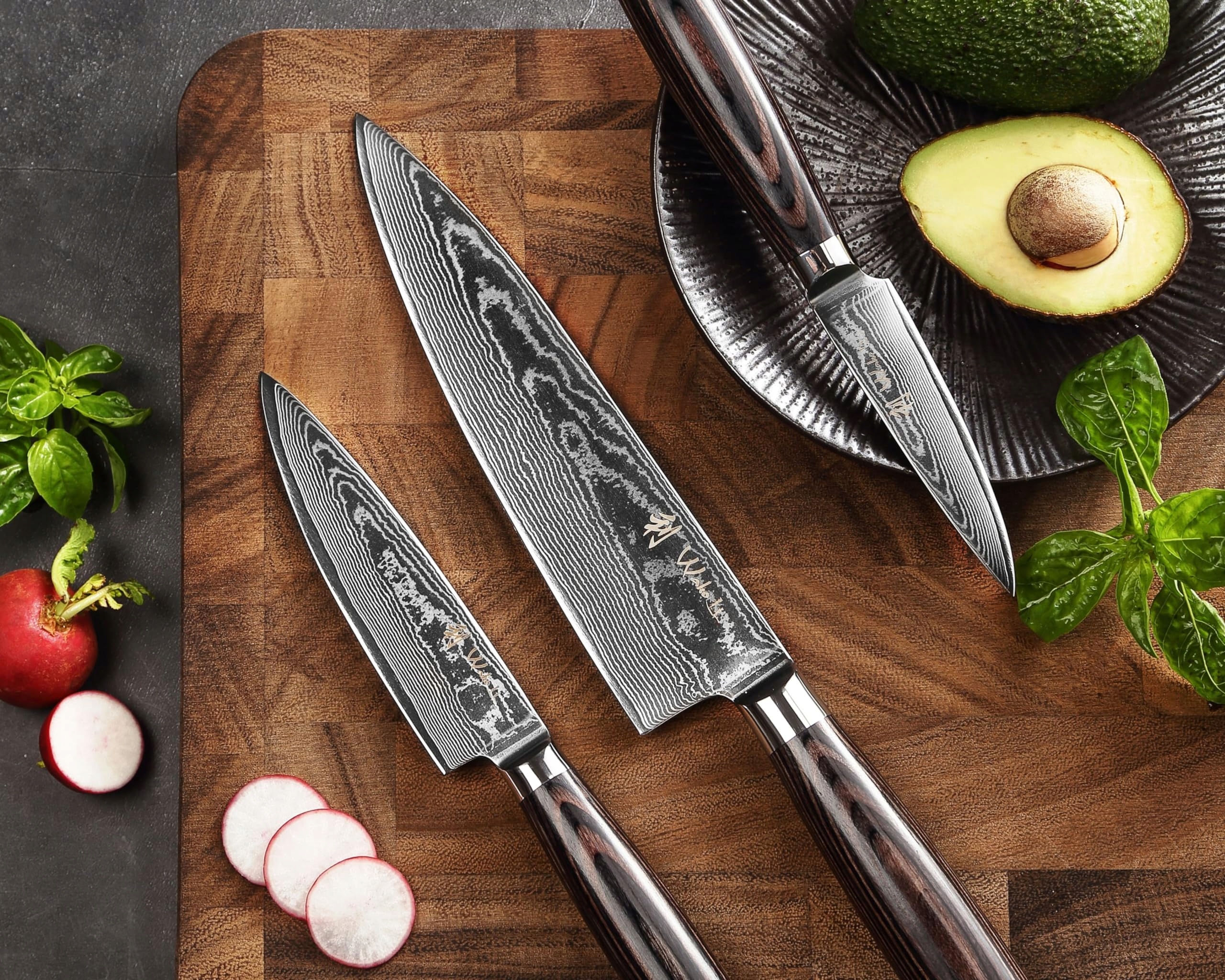 �CECHY NOŻY: Zestaw noży Wakoli EDIB Essentials zawiera nóż szefa kuchni o długości 20 cm, mały nóż szefa kuchni o długości 13 cm oraz nóż biurowy o długości 10 cm. Wszystkie ostrza wykonane są z 67 warstw stali damasceńskiej z rdzeniem VG10, co osiąga twardość ostrza 60±1 HRC. Te profesjonalne noże kuchenne są i pozostają wyjątkowo ostre.