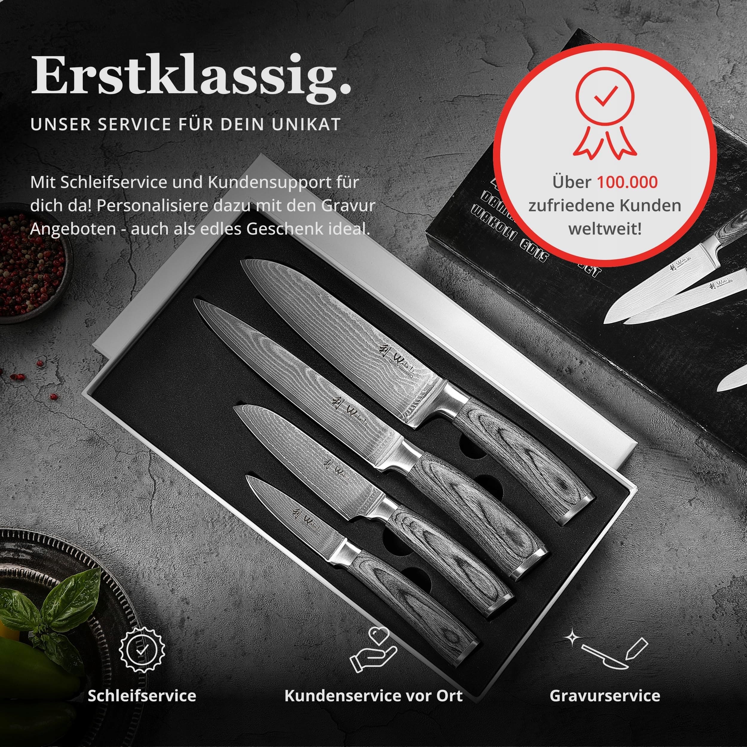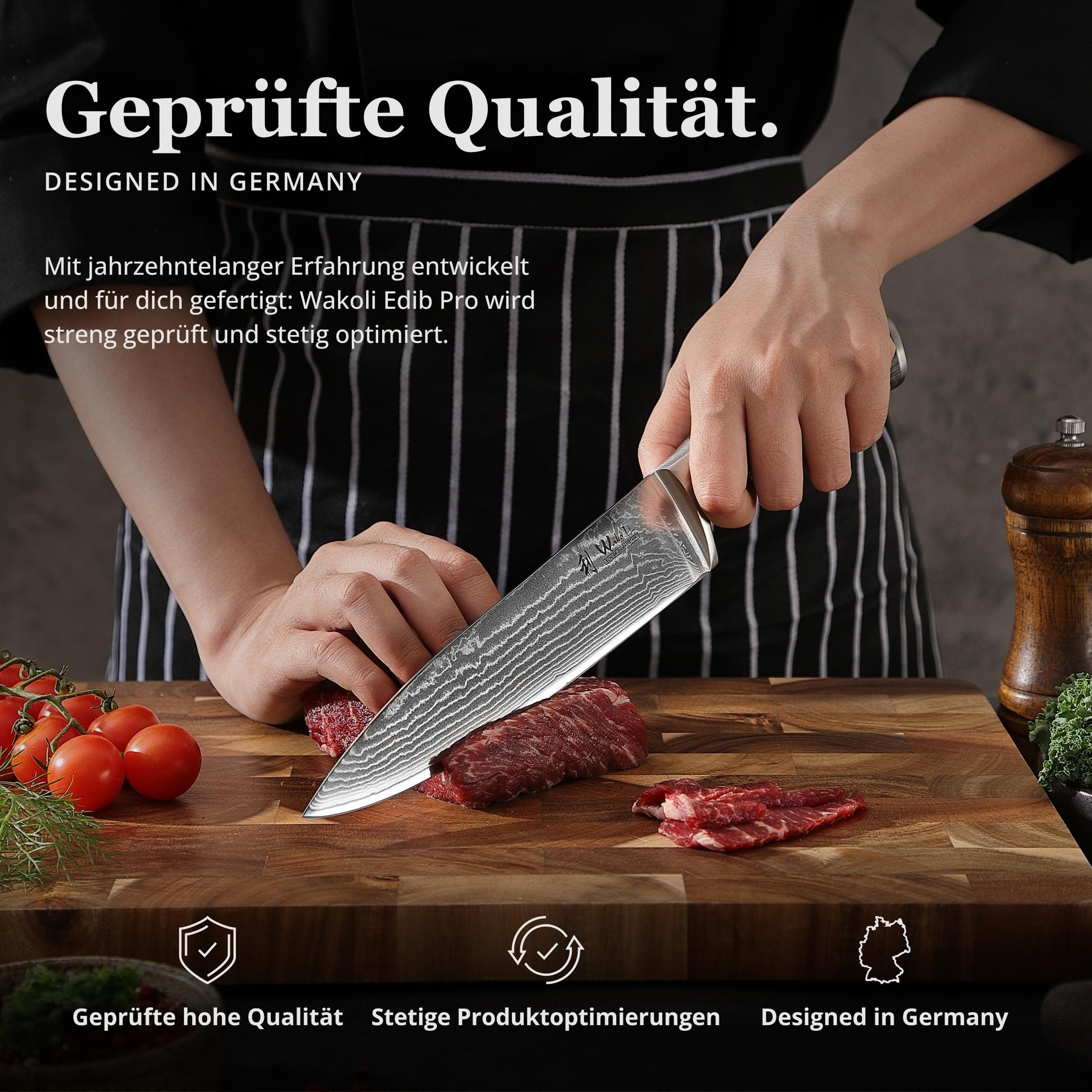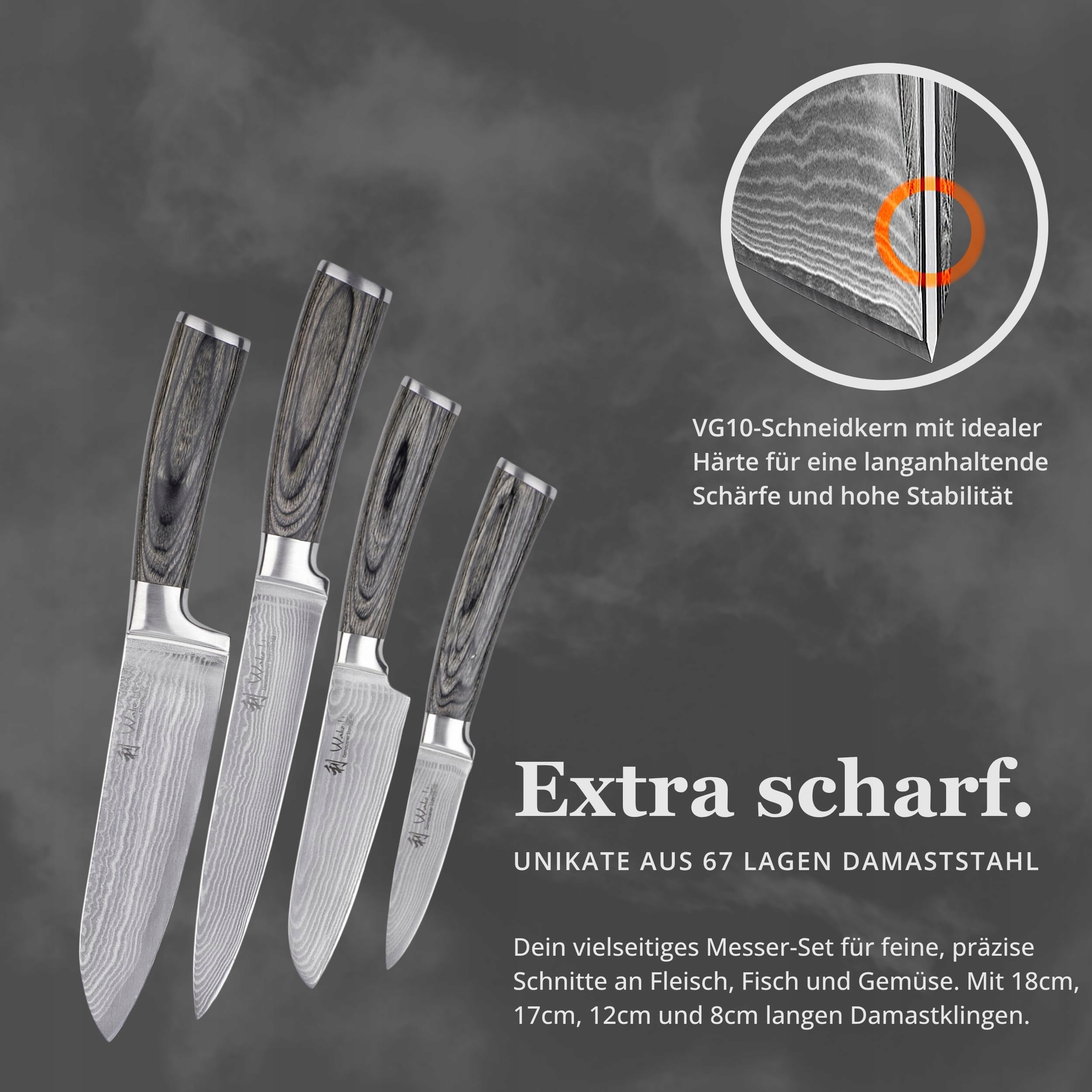 Wysokiej jakości materiały - idealnie dopasowane – Wszystkie ostrza wykonane są z 67 warstw prawdziwej stali damasceńskiej z rdzeniem VG10 (60 ± 2 HRC). Dzięki połączeniu różnych noży kuchennych damasceńskich, precyzyjnemu szlifowi i solidnej konstrukcji zestaw noży oferuje maksymalną wszechstronność. Ergonomiczne uchwyty z drewna Pakkaholz leżą wygodnie i pewnie w dłoni.