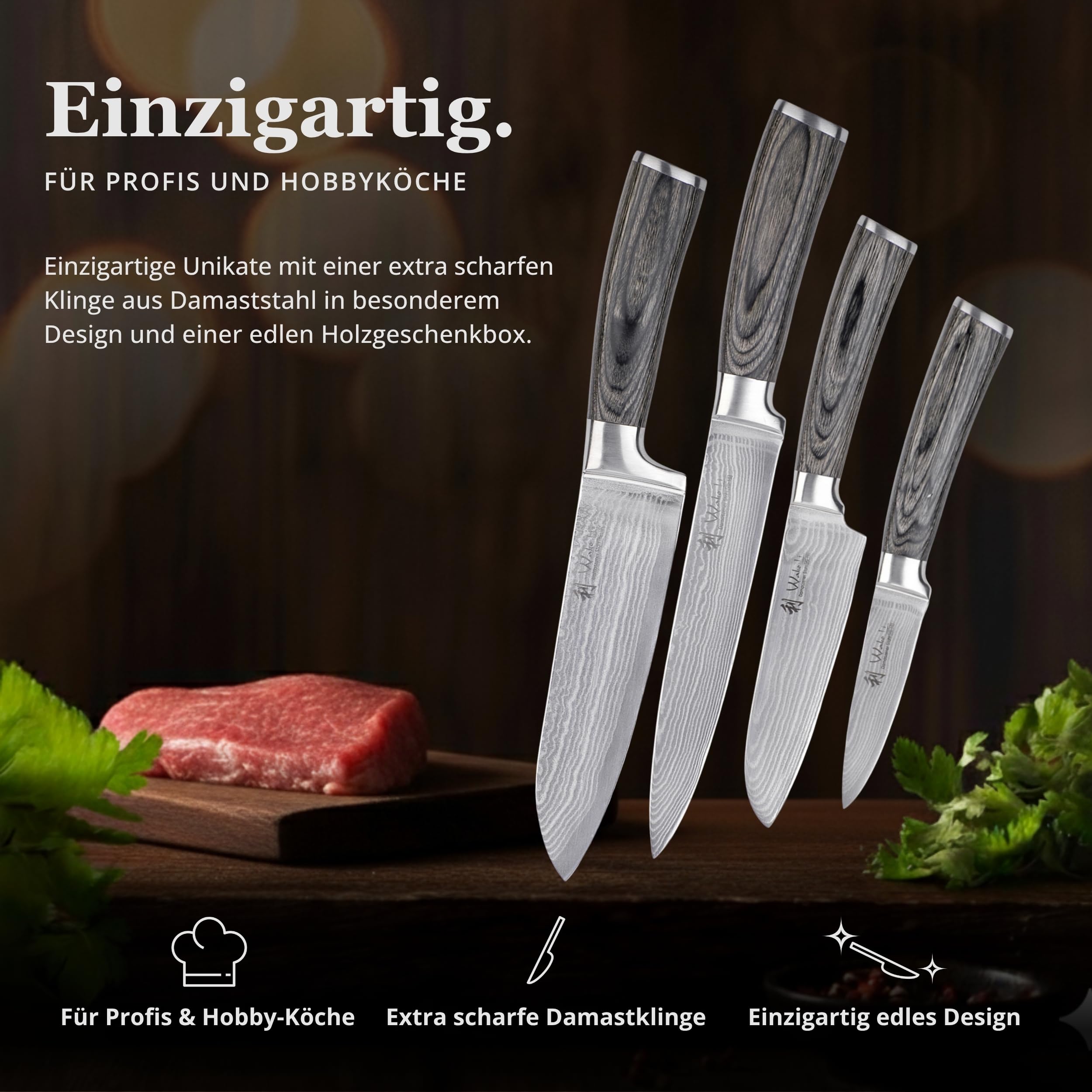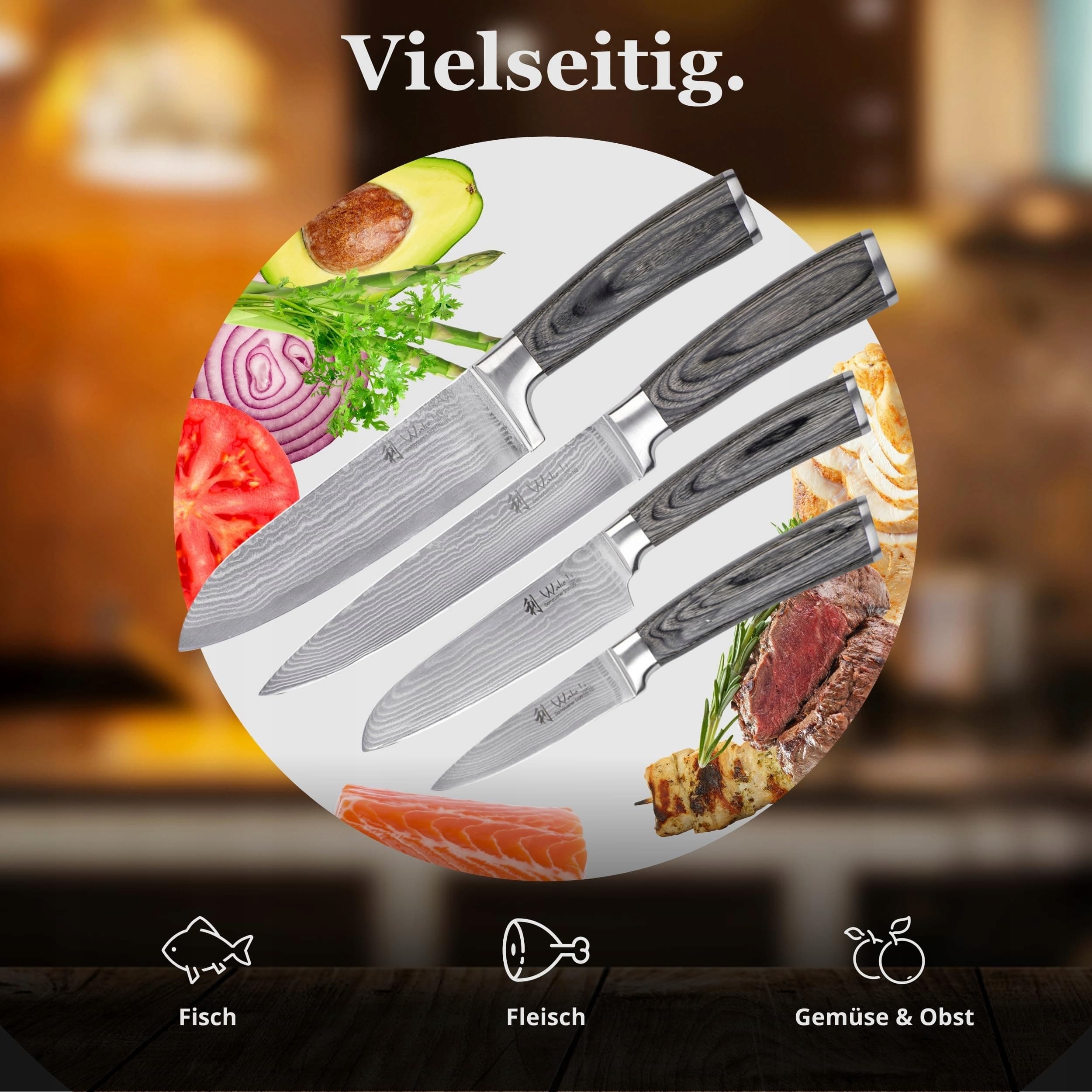 Zestaw noży do każdego zadania krojenia – 4-częściowy zestaw noży kuchennych z damasceńskiej stali zawiera nóż Santoku z ostrzem o długości 17 cm i całkowitej długości 30 cm, nóż do mięsa z ostrzem o długości 18 cm i całkowitej długości 31 cm, mały nóż Santoku z ostrzem o długości 12 cm i całkowitej długości 24 cm oraz nóż do warzyw z ostrzem o długości 8 cm i całkowitej długości 20 cm. Idealny do precyzyjnego krojenia warzyw, ryb i mięsa – od wszechstronnego noża uniwersalnego po delikatny nóż do krojenia, wszystko w zestawie.