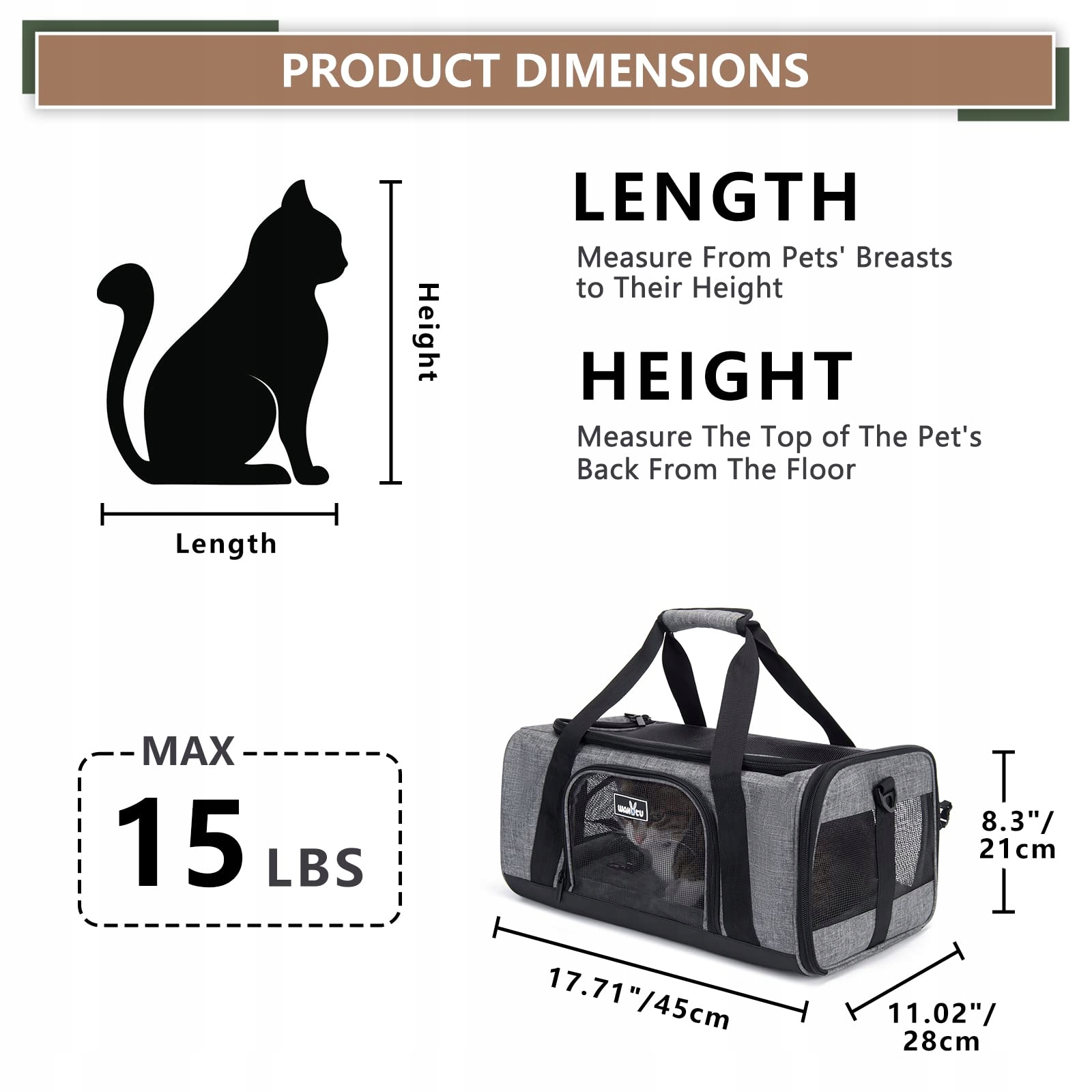 �[PODRÓŻE LOTNICZE]: Złożony rozmiar: 17,5 (L) x 11,2 (B) x 3 (H) cale; Rozłożony rozmiar: 17,7 (L) x 11 (B) x 8,3 (H) cale. Torba Wakytu dla zwierząt spełnia większość wymagań linii lotniczych dotyczących przewozu zwierząt i może być umieszczona pod przednim siedzeniem w kabinie. Maksymalne wymagania dotyczące rozmiaru transporterów dla zwierząt z miękkimi ściankami w dużych liniach lotniczych: Lufthansa 21 x 15 x 9'' British Airways 22 x 18 x 10'' Virgin Atlantic 22 x 14 x 9'' Easyjet 22 x 18 x 10''