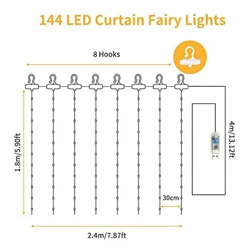 [144 LED Lichtervorhang 2,4m x 1,8m]LED Lichterkette 2,4m x 1,8m z 144 ciepłymi białymi LED, Każdy USB Lichtervorhang ma 8 złączy (po 144 LED / złącze). Dostarczamy 8 haczyków do Lichtervorhang wewnątrz. Można go łatwo zamontować na ścianie, oknie, drzwiach, suficie itp., aby stworzyć ciepłą i romantyczną atmosferę