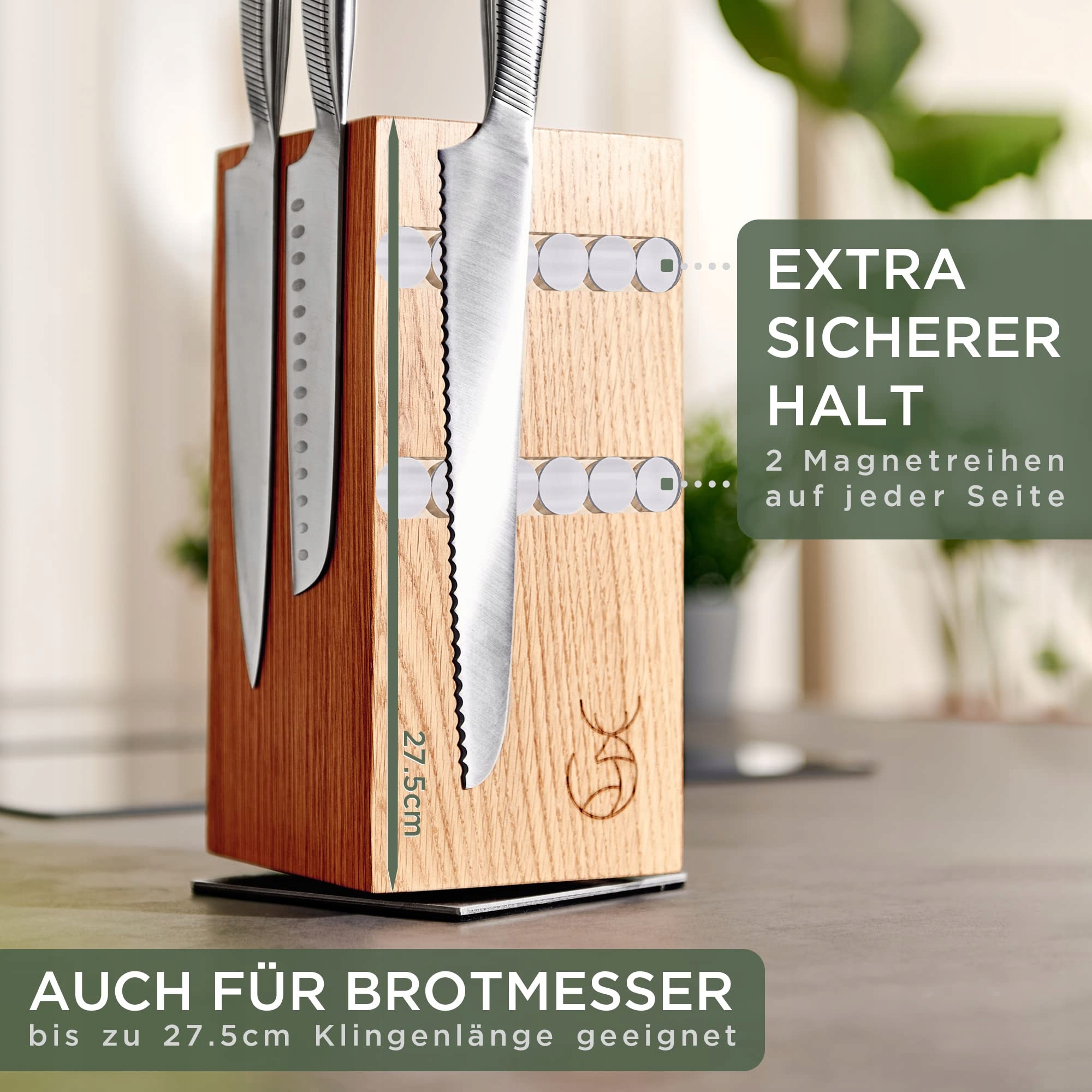 🌲 SZLACHETNE MATERIAŁY – Wysokiej jakości drewno dębowe i stal nierdzewna gwarantują maksymalną trwałość. Drewno dębowe zapewnia szczególnie trwałe i łagodne podłoże chroniące Twoje noże.