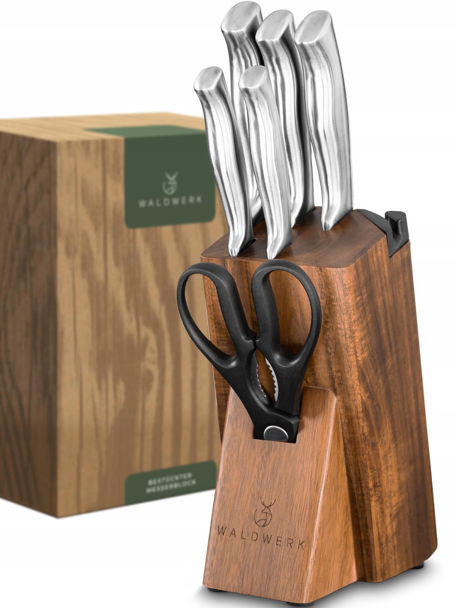 WALDWERK Zestaw Noży Kuchennych 7-częściowy z Blokiem i Ostrzałką | Premium Supply