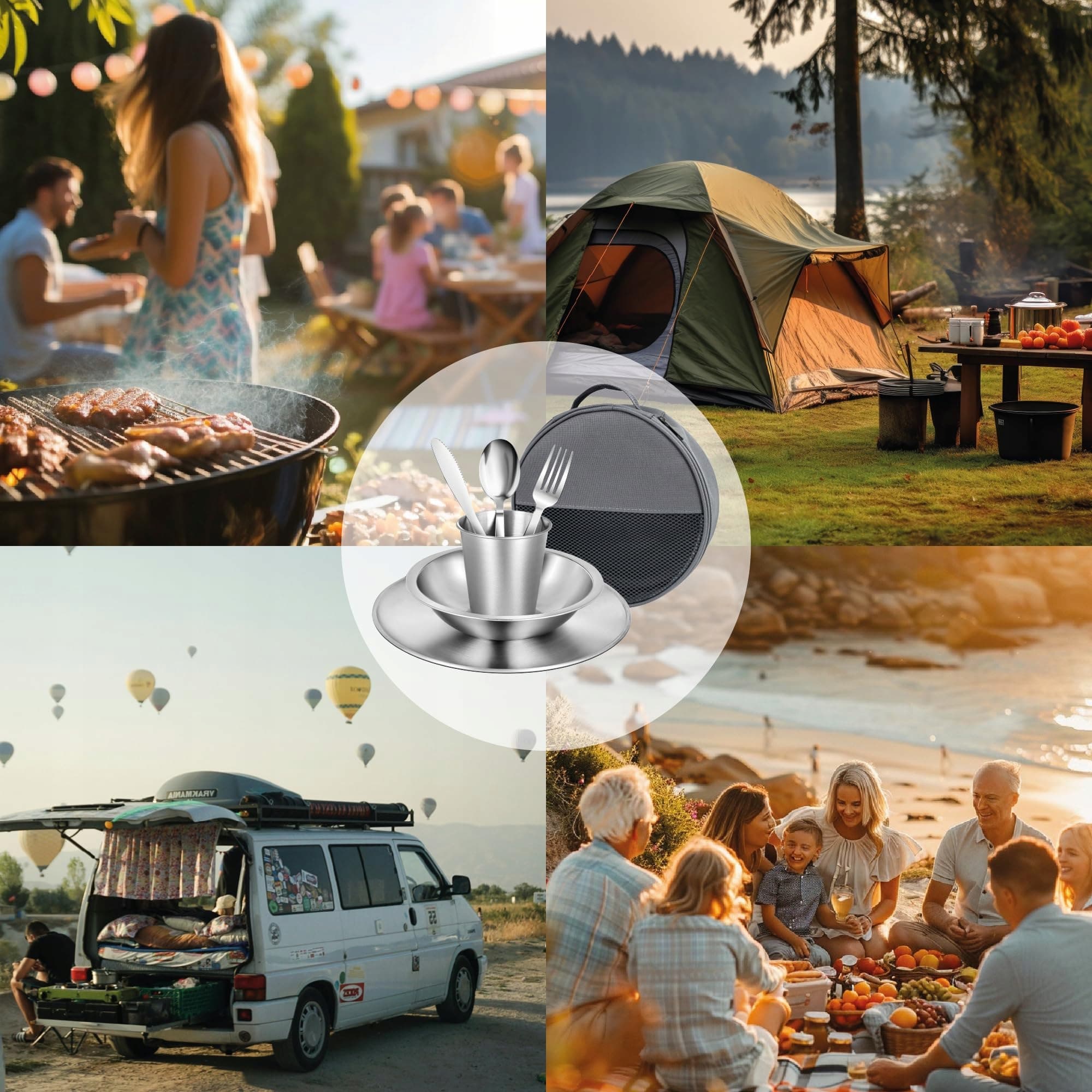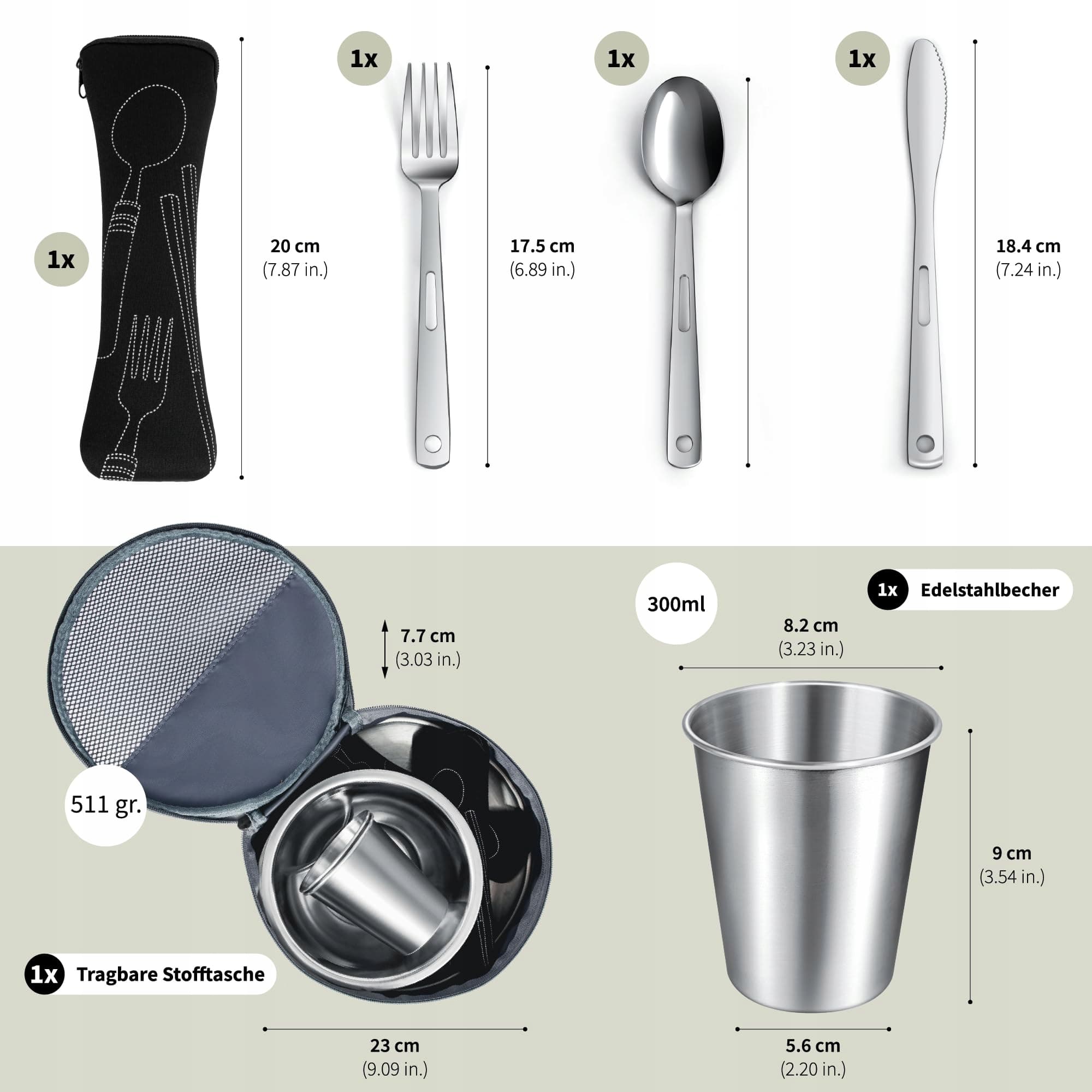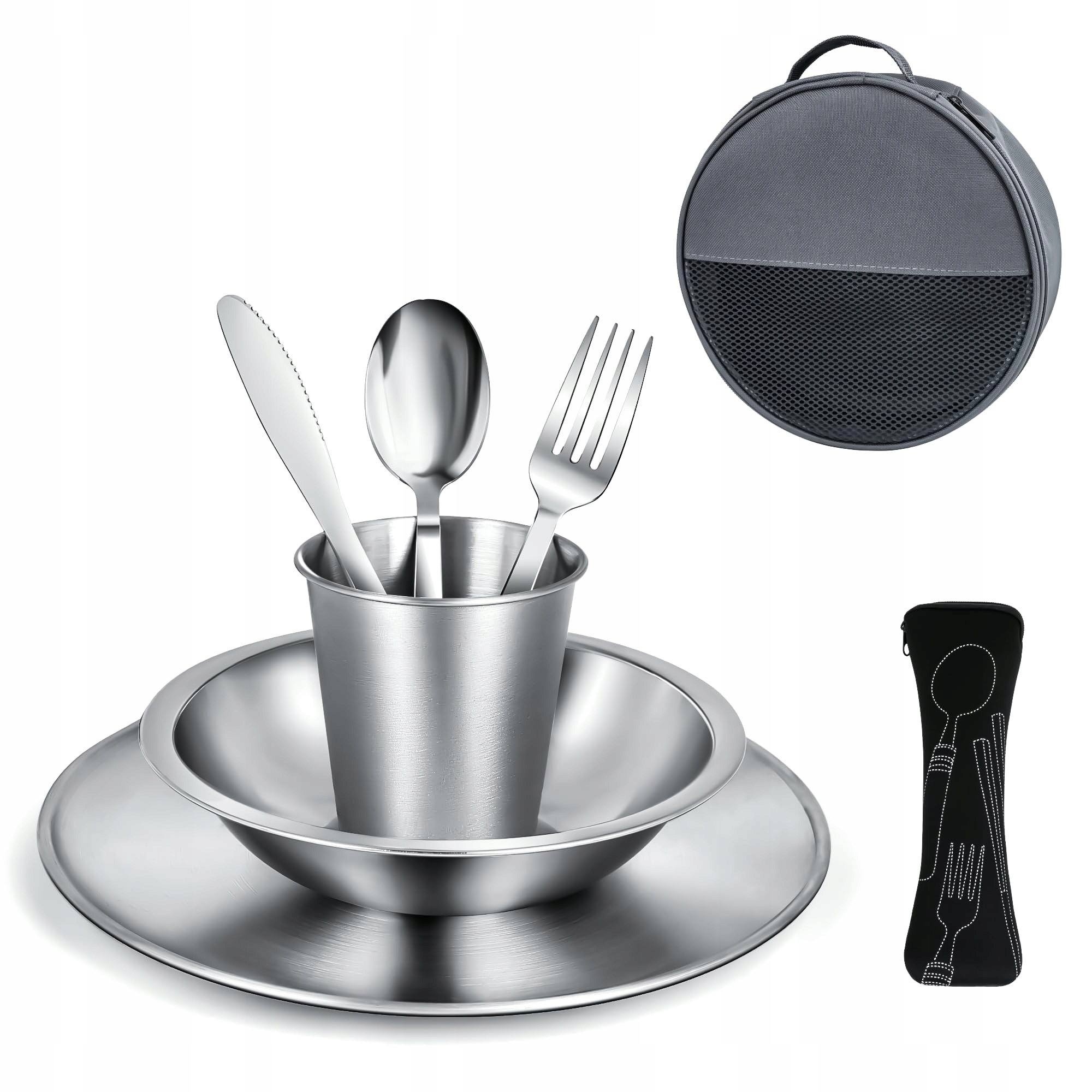 Zestaw sztućców kempingowych dla 1 osoby – zestaw naczyń kempingowych ze stalowymi sztućcami, talerzem, miską i szklankami. W zestawie etui na sztućce. Przenośny zestaw naczyń na zewnątrz, piknik i grillowanie. [8 elementów]