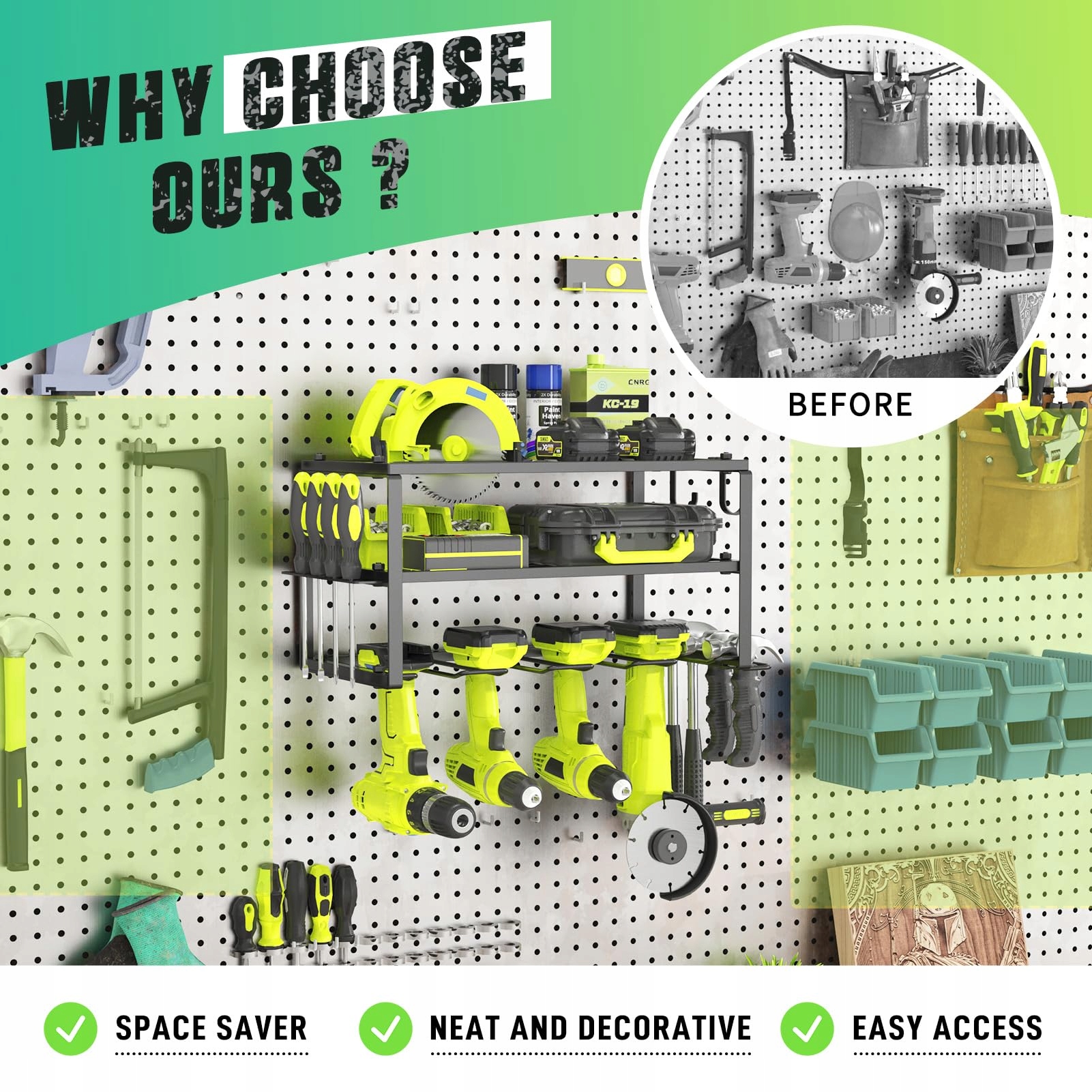 Wysoka nośność: Ten uchwyt wiertarski może unieść do 60 kg. 4 gniazda są idealne do przechowywania wiertarek elektrycznych, 2 półki na piły tarczowe, duże młotki lub duże skrzynki narzędziowe.