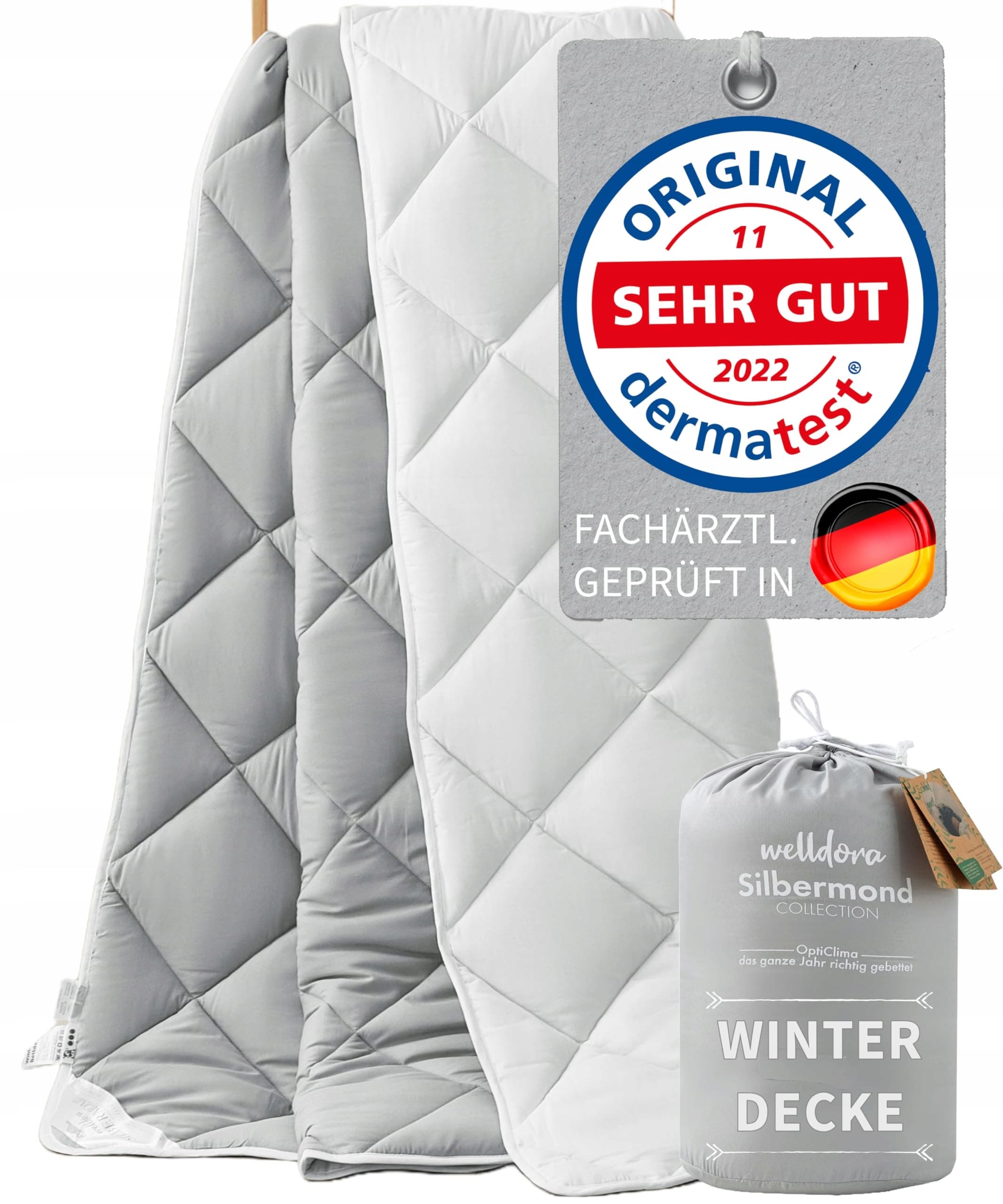 Welldora OPTICLIMA Kołdra dla alergików 200x200 Zima | Zbadana przez specjalistów | Made in Green Oeko-Tex cert. w Niemczech | Ultra ciepła kołdra zimowa | Kołdra dwustronna Srebrnoszara-Biała | Premium kołdra pikowana
