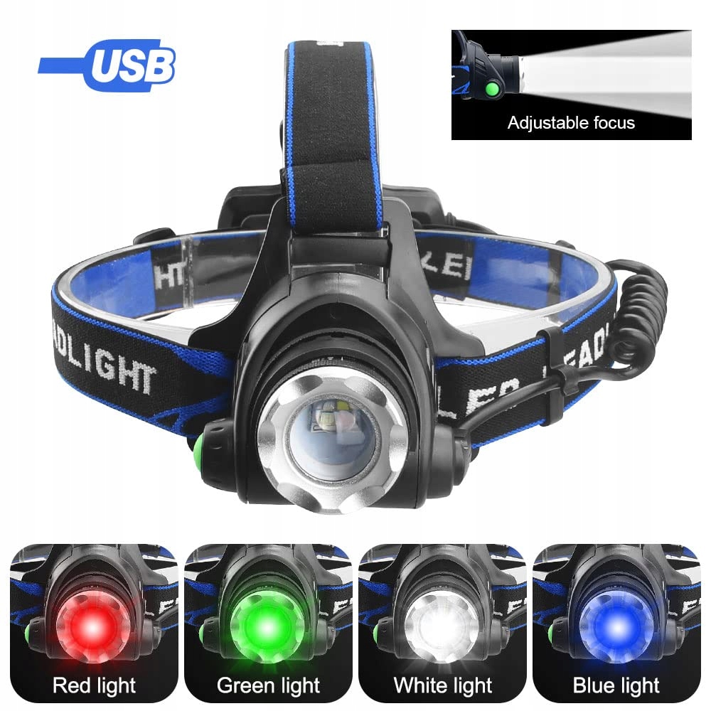 Trwała i wygodna: Wykonana z wysokiej jakości stopu aluminium. Ta czołówka outdoorowa z opcją czerwonego, zielonego, białego i niebieskiego światła jest trwała i wytrzymała; regulowany i elastyczny pasek na głowę, wygodny w noszeniu.