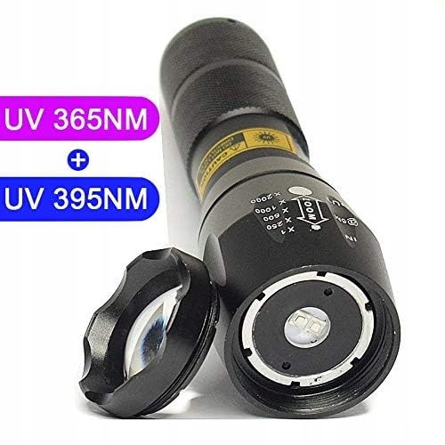 395nm i 365nm 2 w 1 światło latarki UV jest regulowane pod względem ogniskowania. Pozwala na pokrycie większego obszaru. Emituje długości fal od 395-400 lub 365-370 nanometrów. Proszę używać w ciemnym otoczeniu dla lepszego efektu.