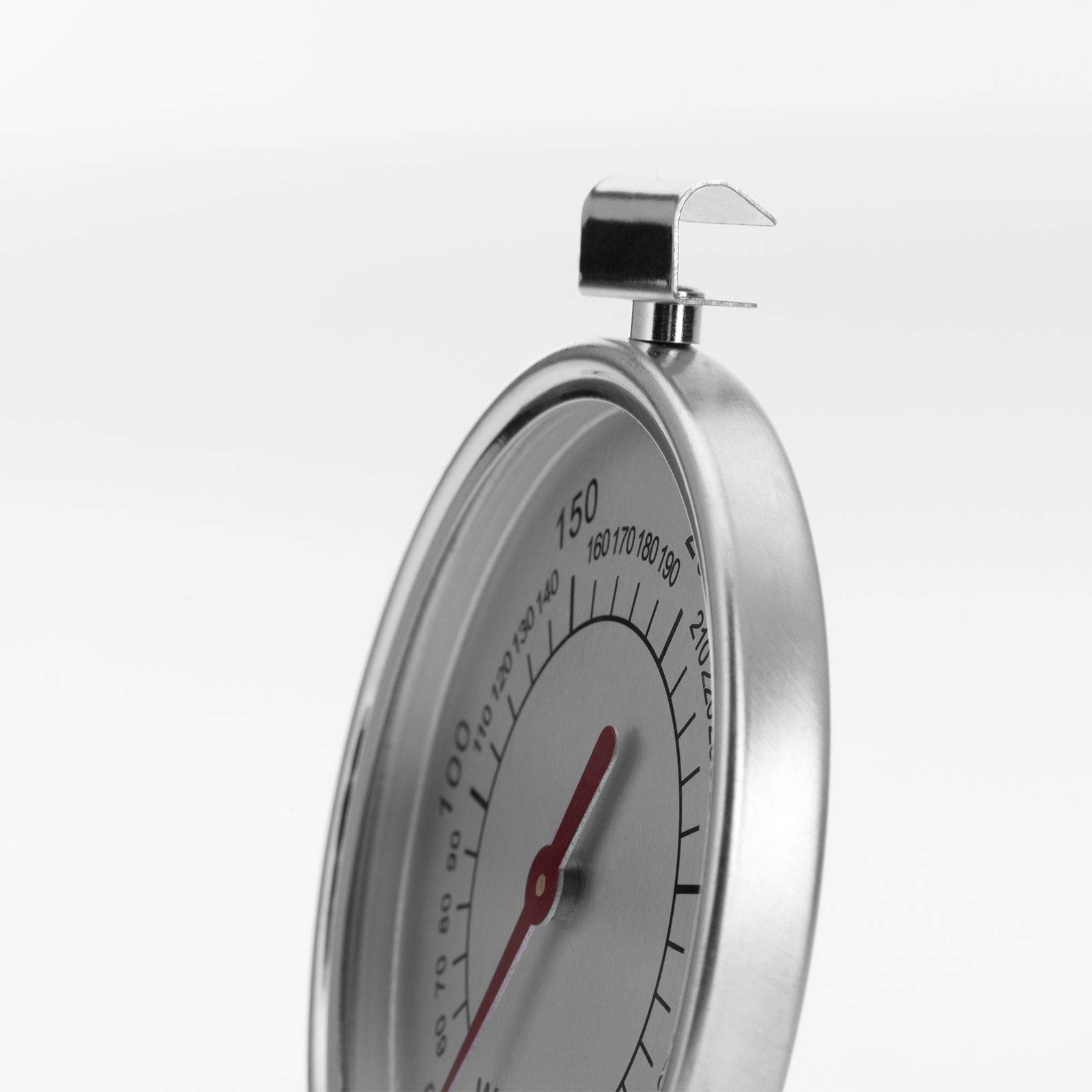 Łatwa obsługa: szeroka podstawa z nierdzewnej stali do ustawienia termometru na dnie piekarnika, hak do zawieszenia termometru na ruszcie lub blaszce do pieczenia