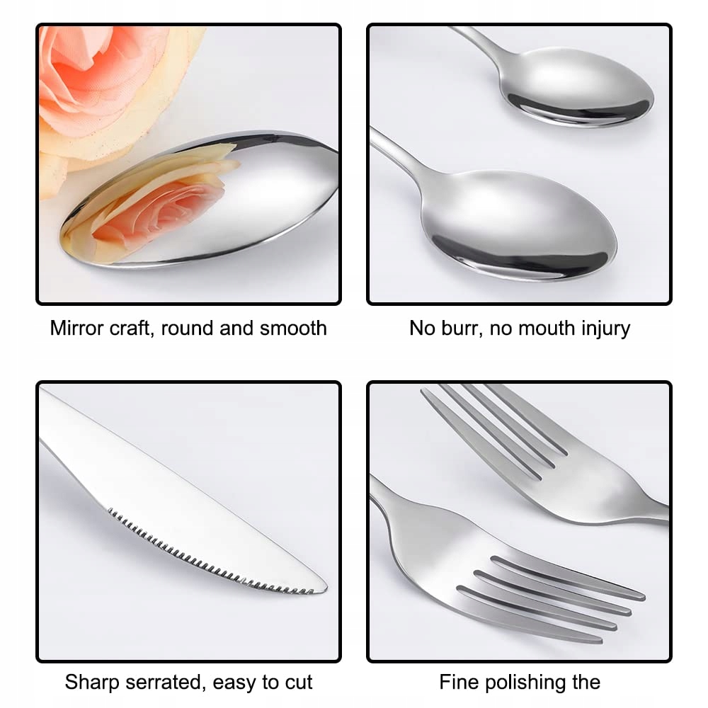 【Nadaje się do zmywarki】 - Nasz zestaw sztućców jest przystosowany do mycia w zmywarce, gładki materiał ze stali nierdzewnej jest łatwiejszy do czyszczenia niż sztućce plastikowe, podczas czyszczenia zestawu sztućców możesz również umyć torbę na sztućce, aby zapobiec rozwojowi bakterii