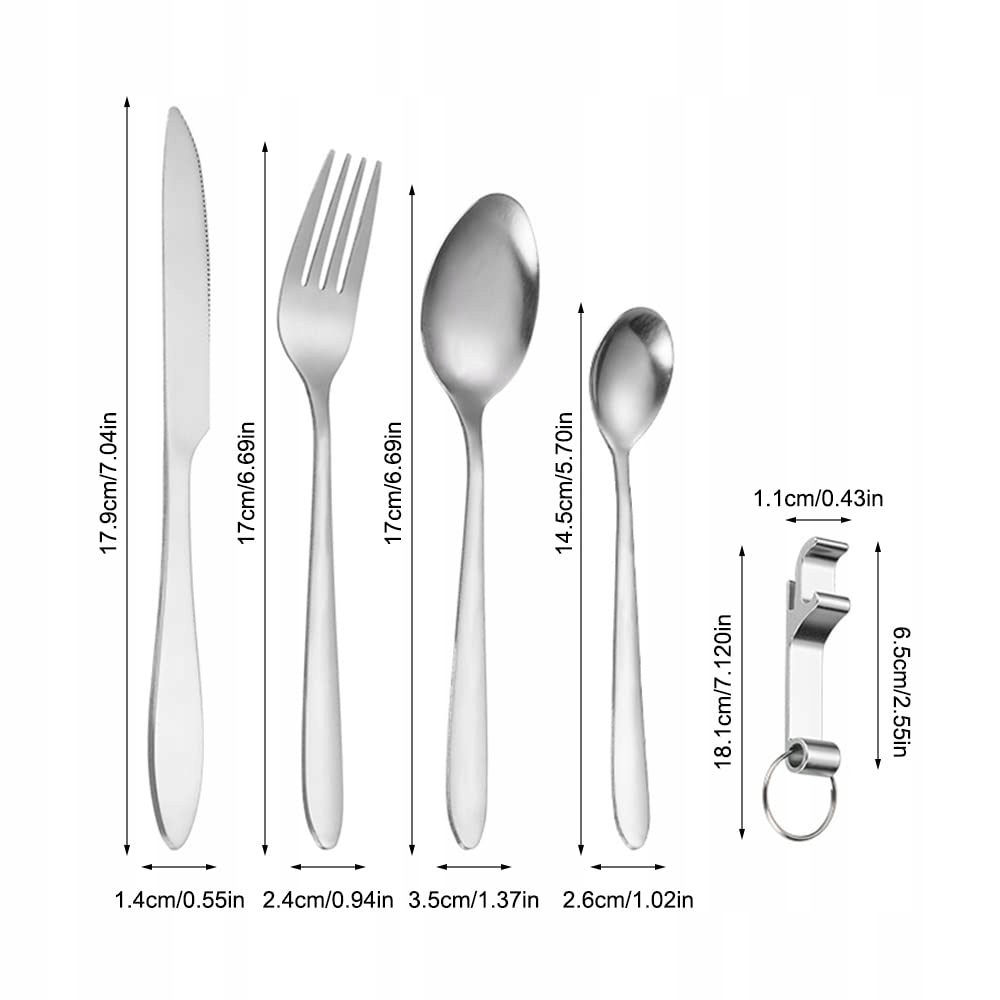 【5-częściowy zestaw sztućców kempingowych】 - Zestaw sztućców zawiera: łyżka - 170 mm x 35 mm, łyżeczka do herbaty - 145 mm x 26 mm, widelec - 170 mm x 24 mm, nóż - 179 mm x 14 mm, otwieracz do butelek 65 mm.