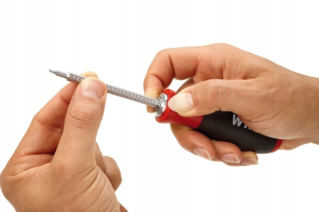 Oszczędzający miejsce wkrętak z wymiennymi podwójnymi ostrzami. Zatrzaskowe mocowanie kulkowe Click-Stop zapewnia pewne trzymanie ostrzy kombinowanych.