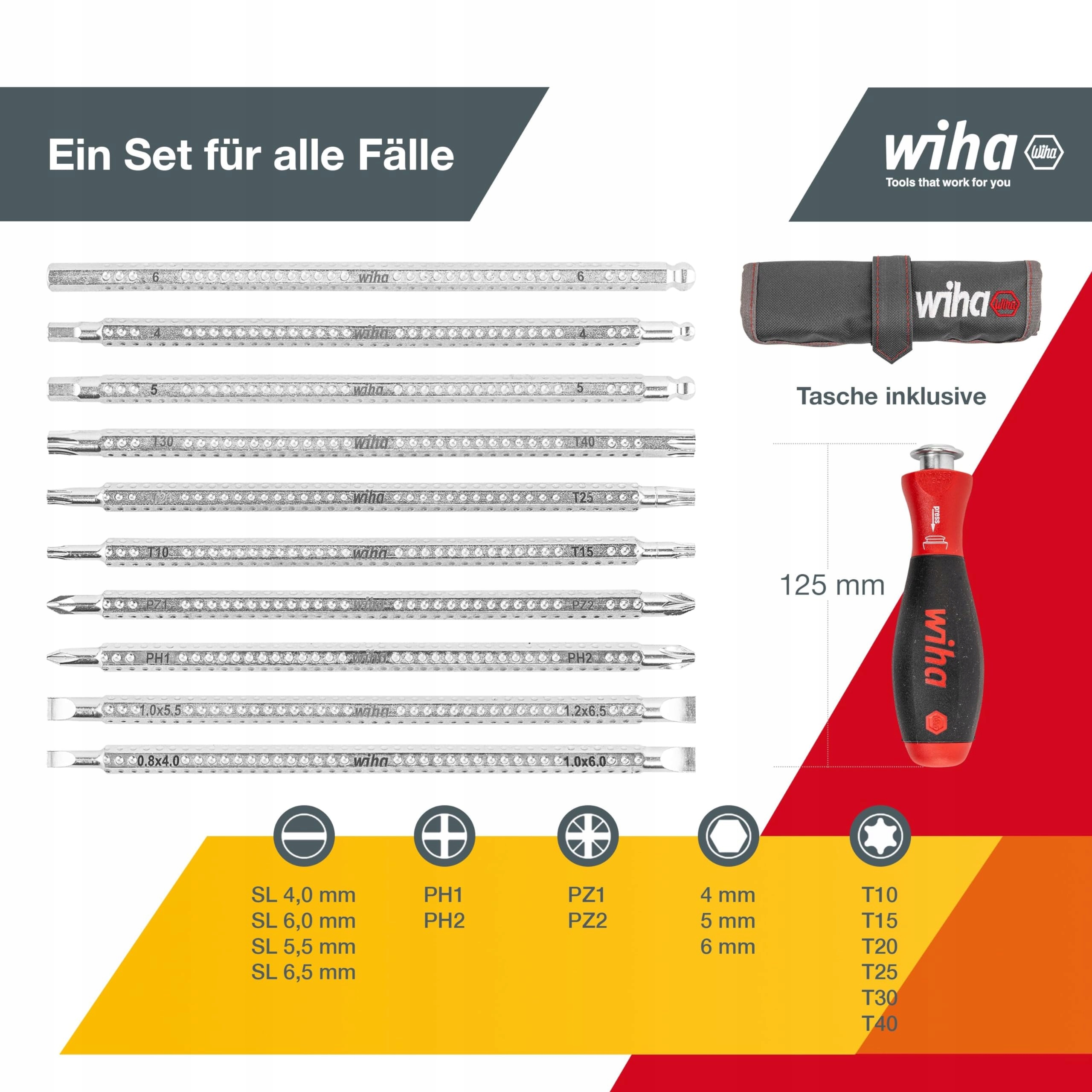 1x uchwyt SoftFinish-telescopic 2x slot 4,0&6,0mm I 5,5&6,5mm 1x Phillips PH1&PH2 1x Pozidriv PZ1&PZ2 3x sześciokątna główka kulowa 4&4 I 5&5 I 6&6 3x TORX T10&T15 I T20&T25 I T30&T40 1x torba na narzędzia
