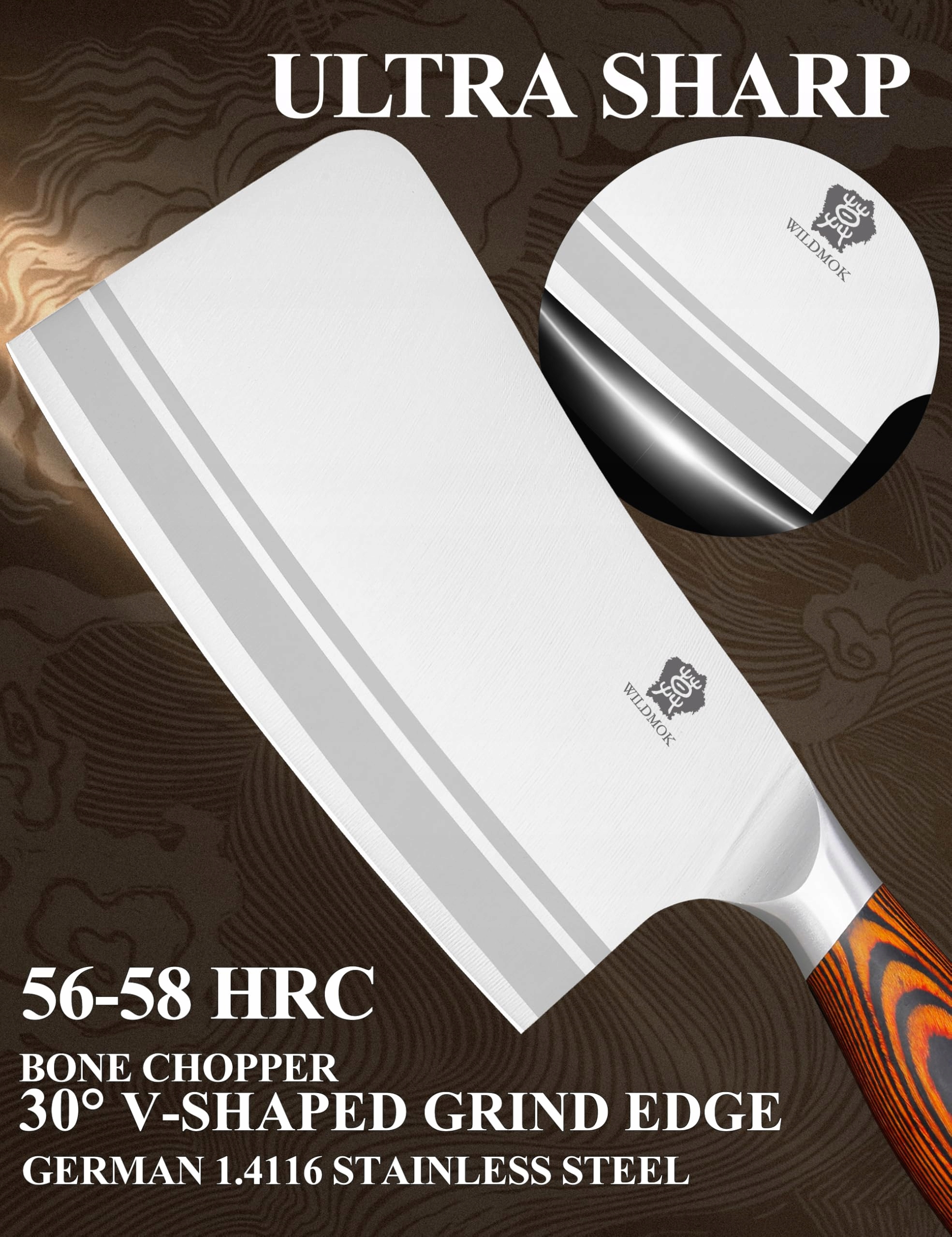 Dobry projekt noża do krojenia: Wildmok uniwersalna siekiera z doskonałym rzemiosłem, idealna do krojenia kości, kurzych łapek, głów ryb, mięsa i wielu innych. Nadaje się do codziennego użytku przez każdego kucharza. Proszę nie kroić zamrożonych produktów, ponieważ może to wpłynąć na krawędź noża.