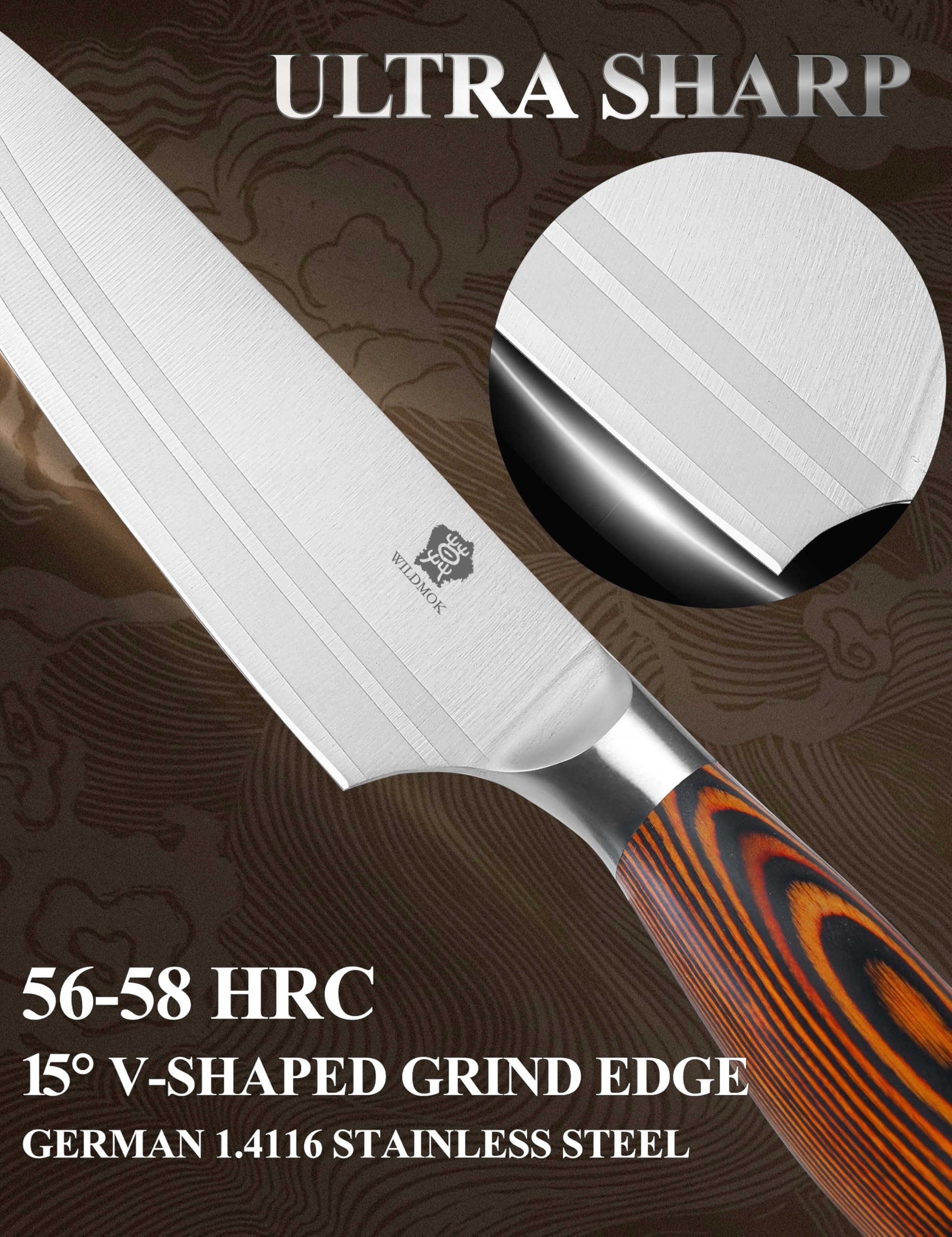 【Dobrze zaprojektowany nóż szefa kuchni】Nóż kuchenny WILDMOK wykonany jest ze stali nierdzewnej X50CrMoV15 i nadaje się do codziennego użytku przez każdego szefa kuchni. Nóż kuchenny jest idealny do warzyw, owoców, ryb i mięsa.
