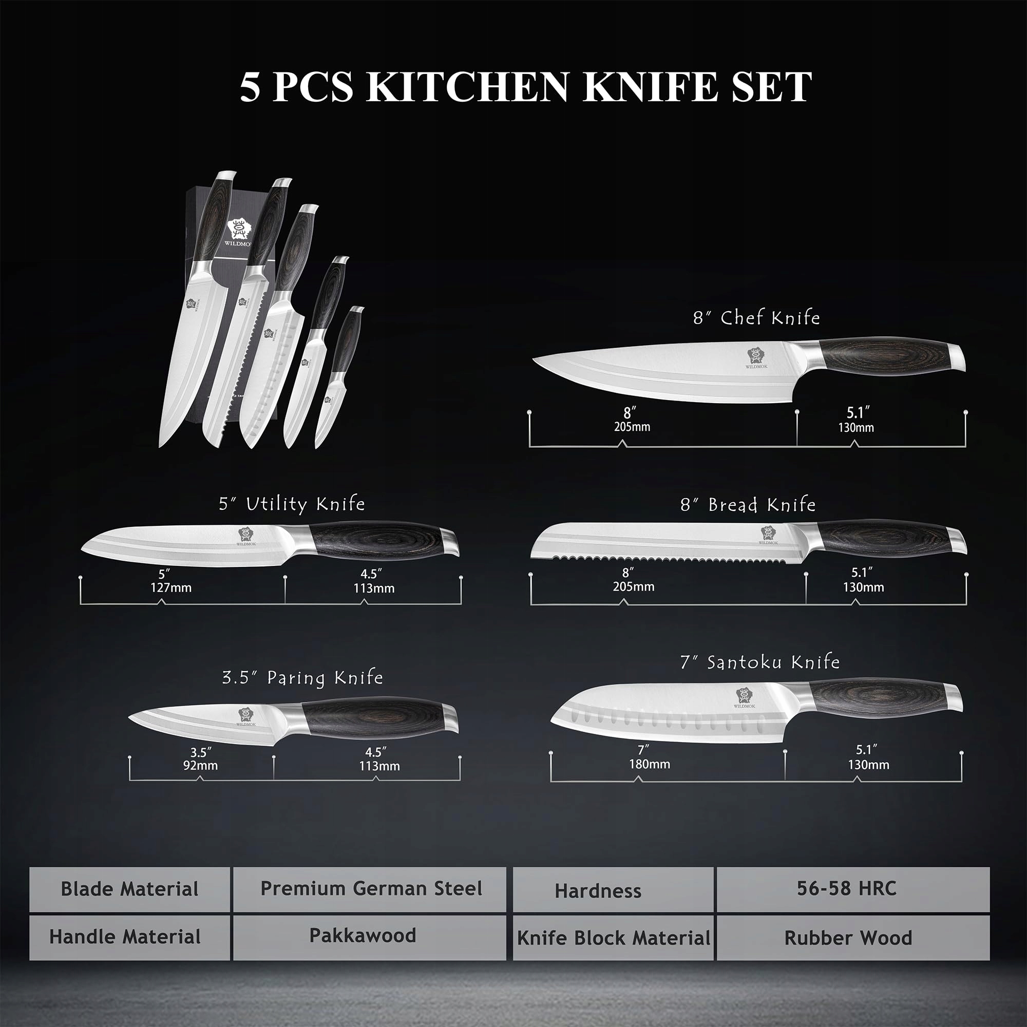 Zestaw noży kuchennych WILDMOK Profi, 5-częściowy zestaw noży kuchennych, niemiecki zestaw noży kuchennych ze stali nierdzewnej w pudełku prezentowym, czarny uchwyt z drewna Pakkaholz