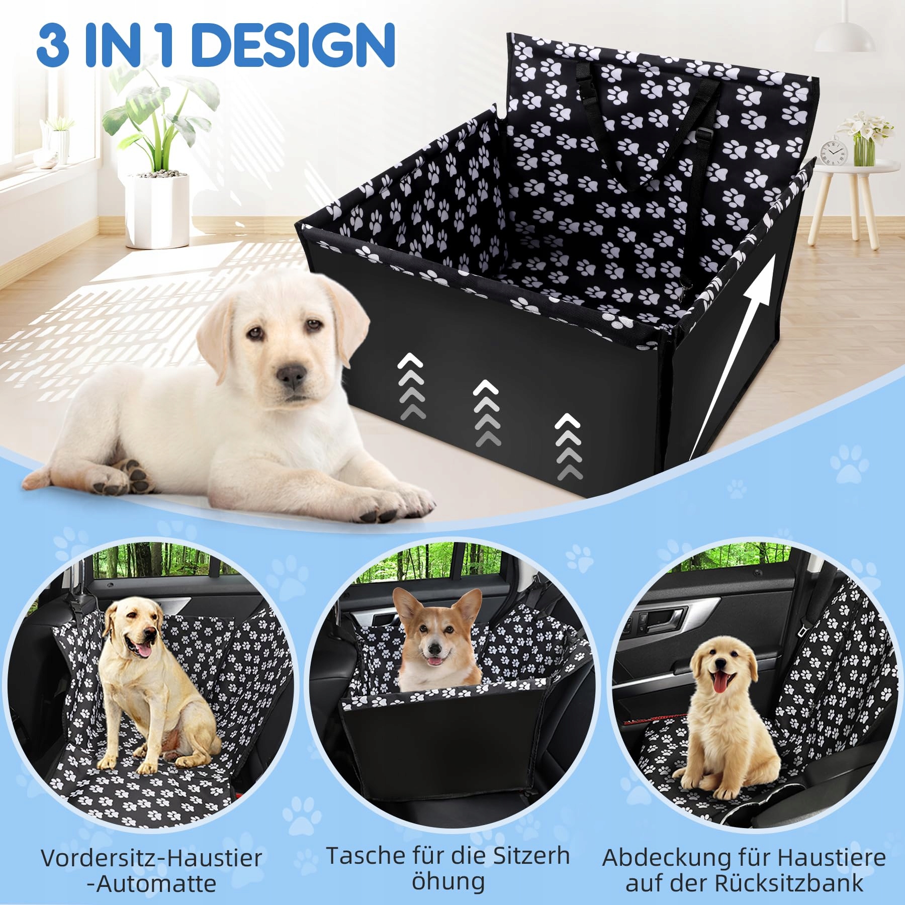 Wielofunkcyjna stabilność: 3 w 1 projekt pokrowca na samochód dla psa, 4 poziome uchwyty na pręty, stabilny i trwały. Używany jako pokrowiec na siedzenie samochodowe, podwyższane siedzenie dla zwierząt, pokrowiec na tylne siedzenie dla psów i kotów. Ekonomiczny i praktyczny, trzy różne zastosowania spełniają potrzeby ochrony siedzeń samochodowych.